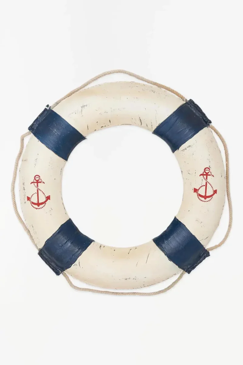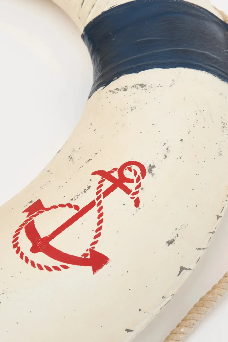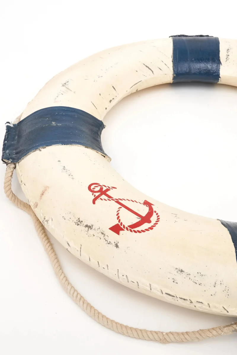 Salvavidas con un toque envejecido que le da un toque auténtico. Lleva un ancla de color rojo pintado en ambos lados.