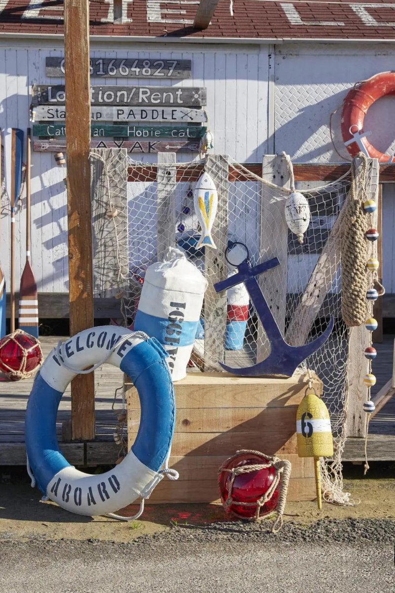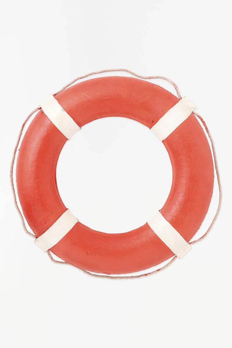 Salvavidas envejecido rojo y blanco. El aspecto antiguo está realmente logrado y le da un carácter marinero auténtico a cualquier rincón del hogar.