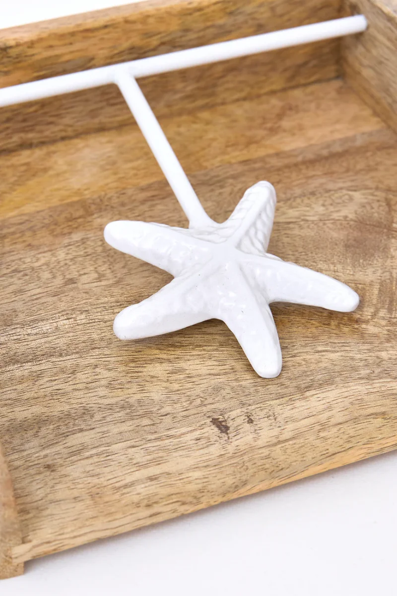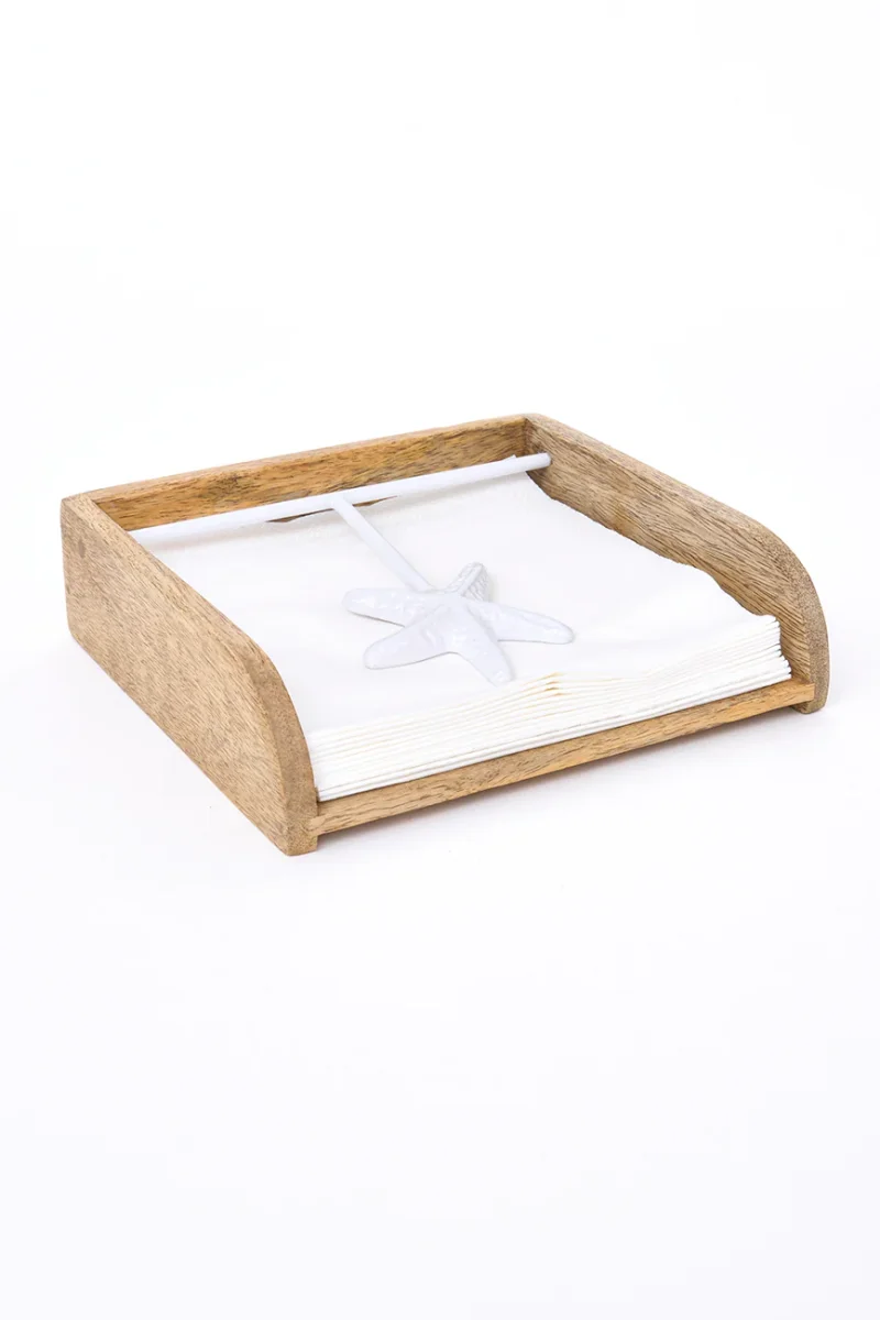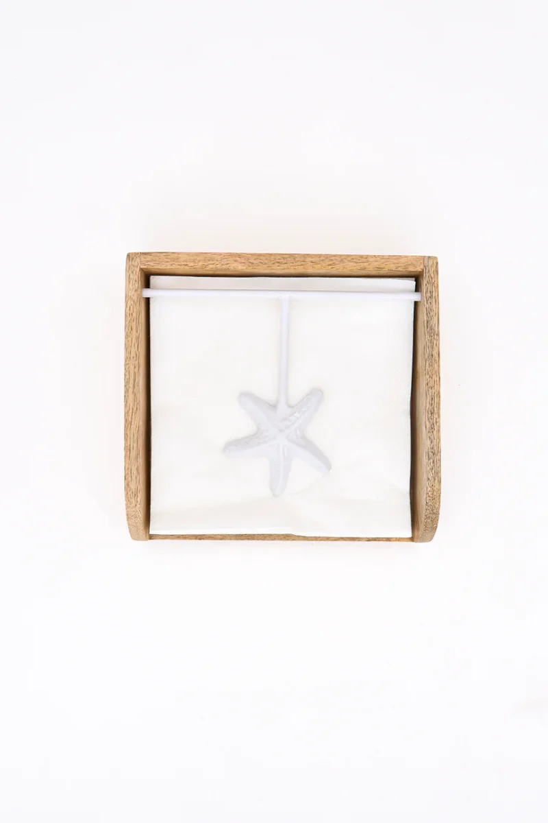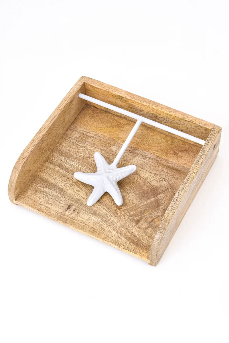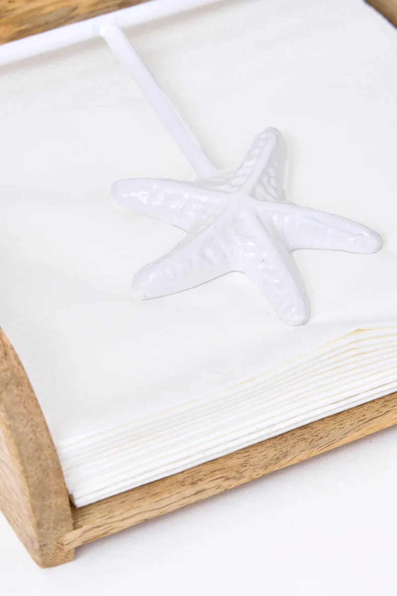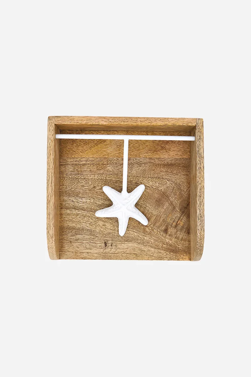 Servilletero elaborado en madera con una estrella de mar de metal que sujeta las servilletas.