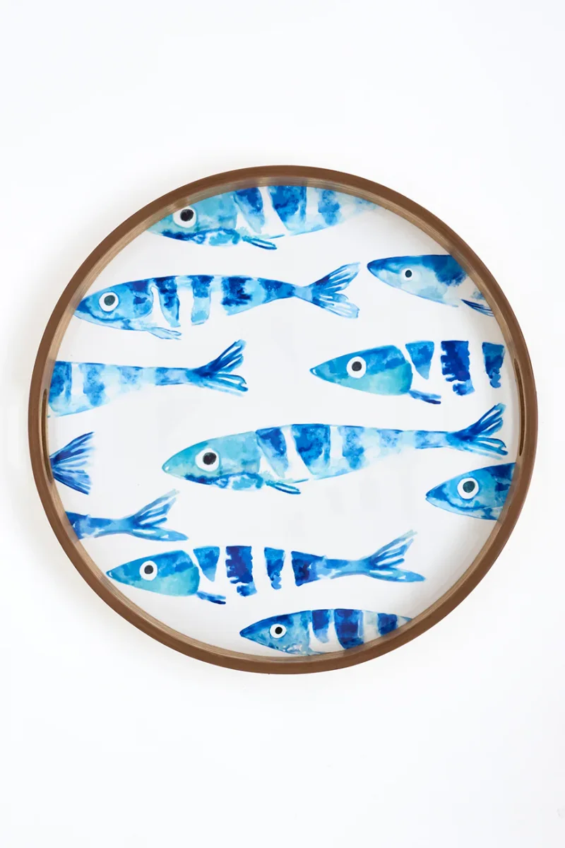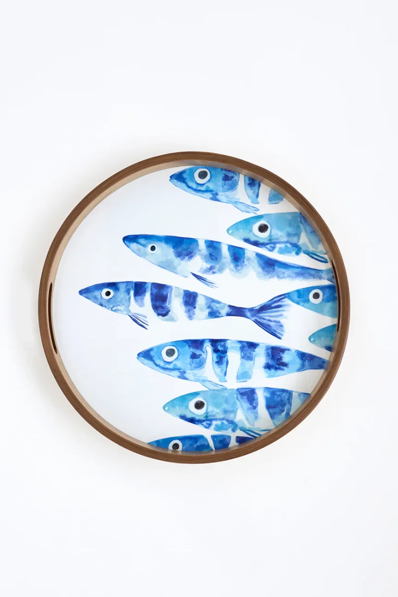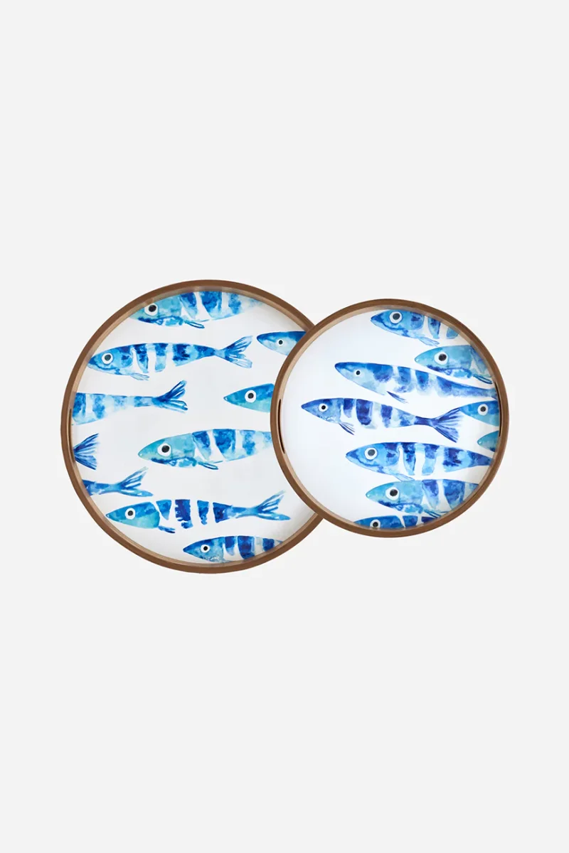 Set de 2 bandejas redondas de madera esmaltada con banco de peces
