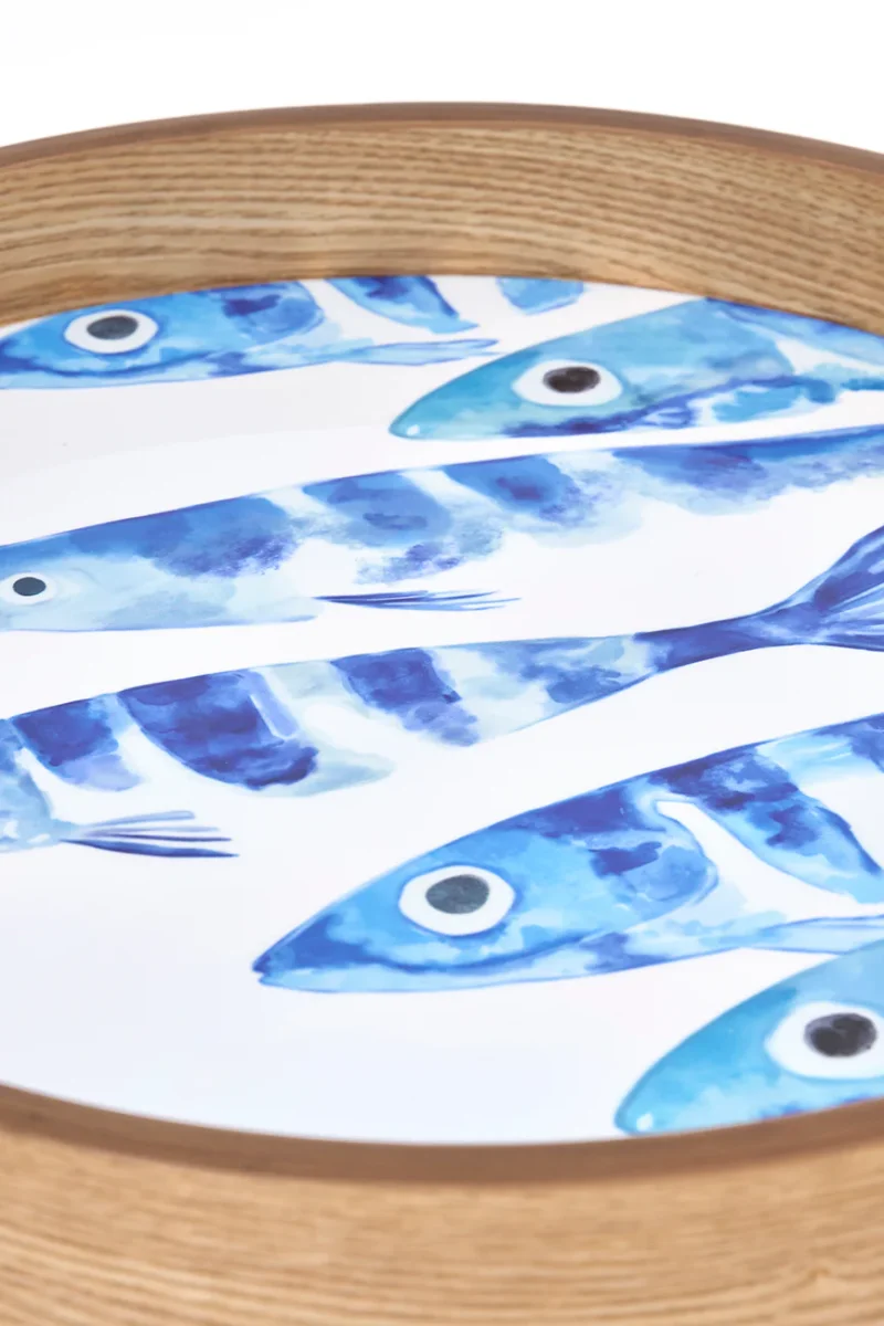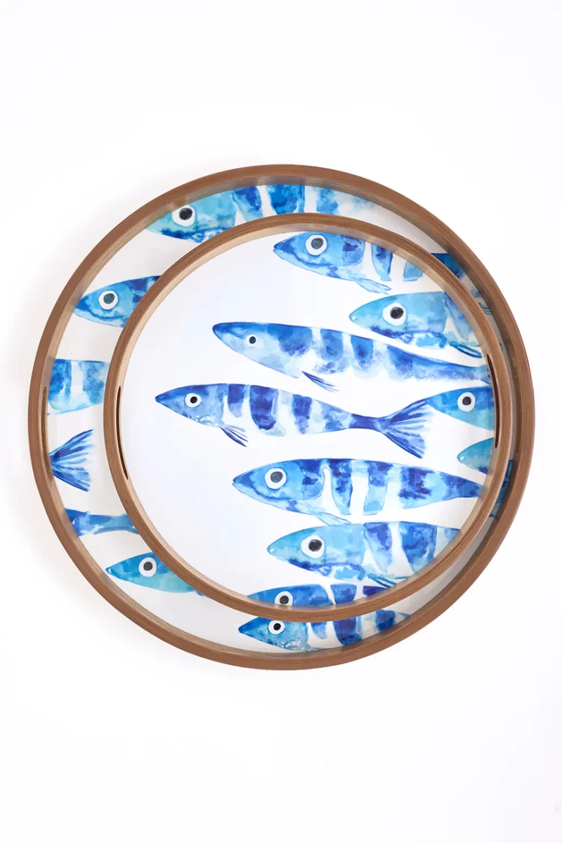Set de dos bandejas redondas de madera con la parte interior esmaltada. Presentan un diseño decorativo de banco de peces. Las patas son desmontables, lo que facilita su uso y almacenaje.
