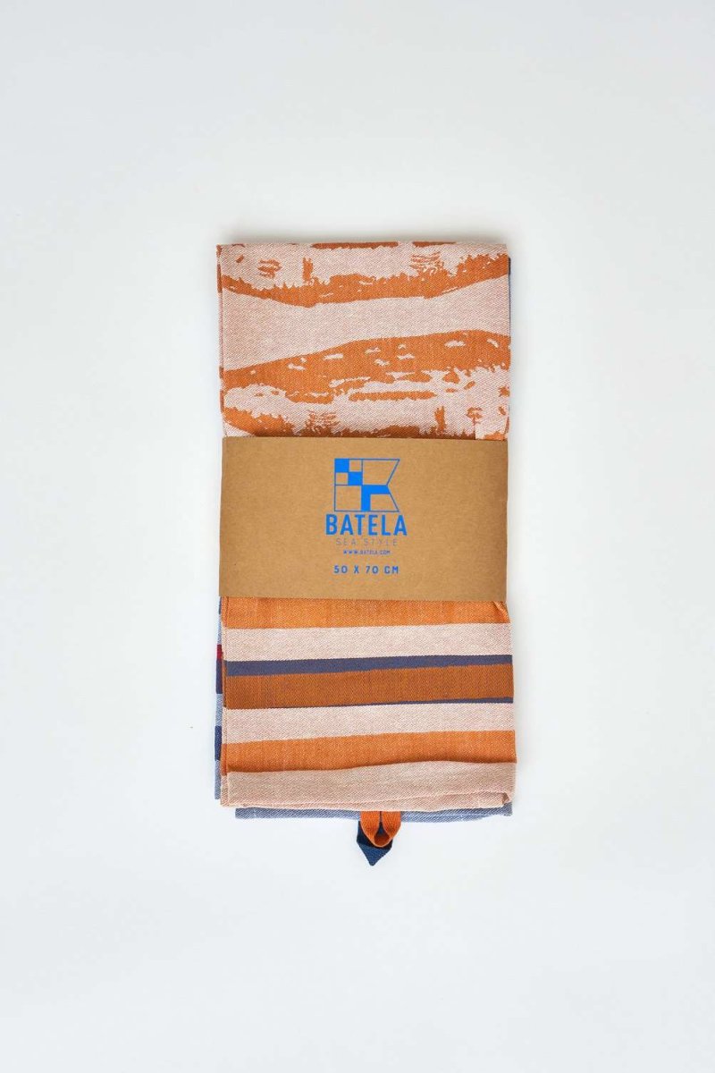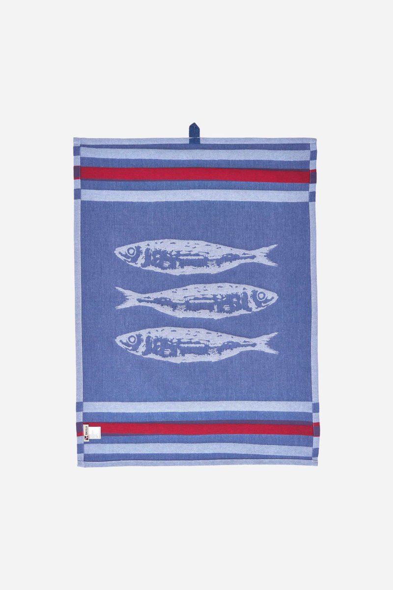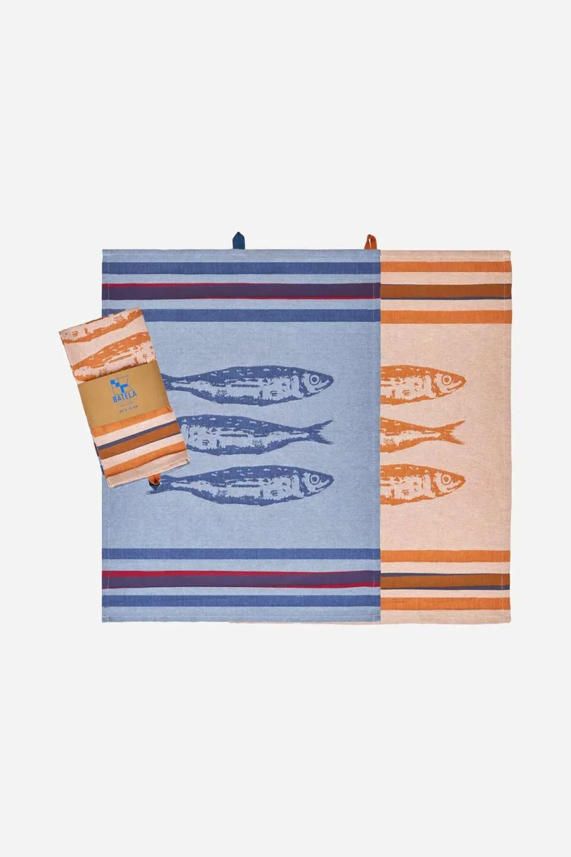 Set de dos paños de cocina de algodón jacquard con diseño de peces y rayas de inspiración marinera. La combinación de colores suaves y contrastados aporta un aire costero y elegante