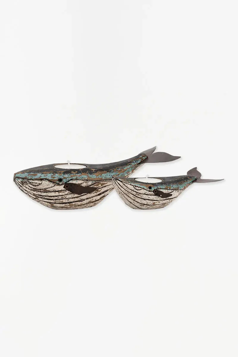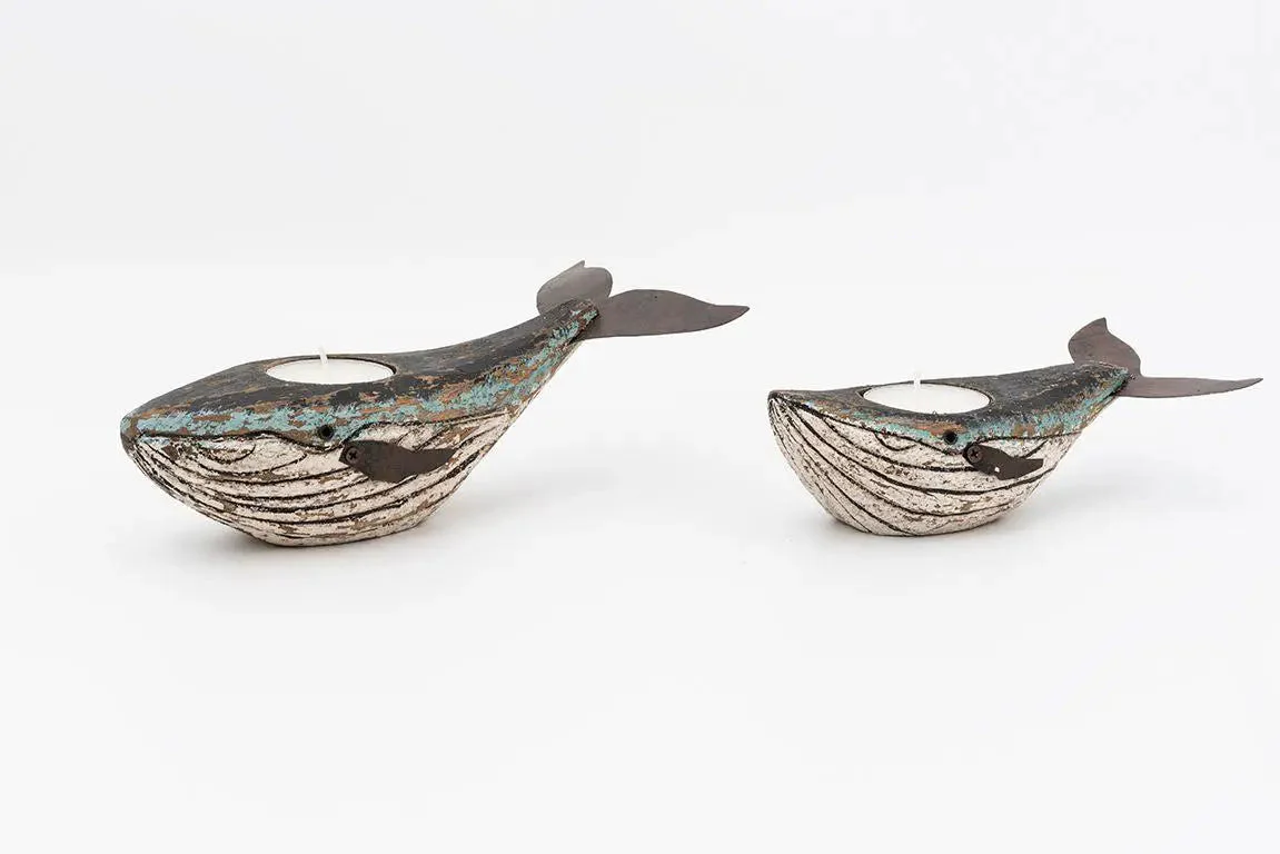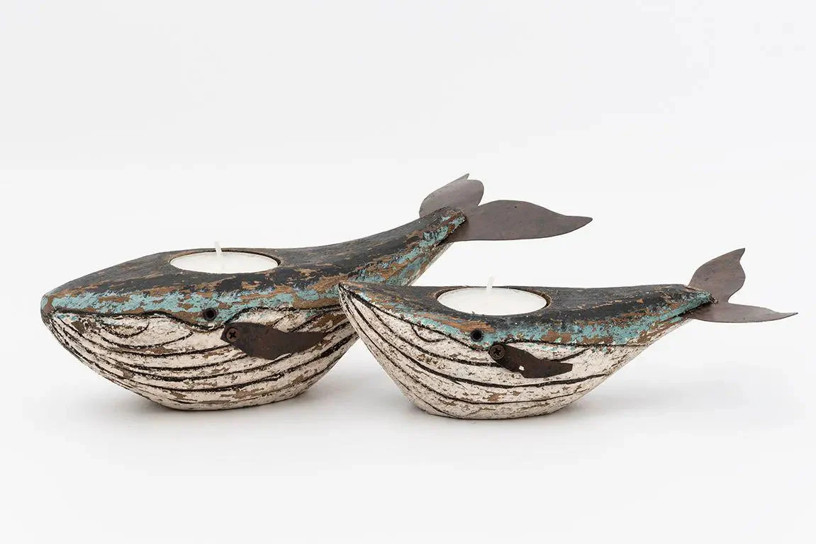 Set de 2 portavelas de madera con forma de ballena y de diferente tamaño. Están pintadas en tonos blancos y azules con un aspecto envejecido precioso.