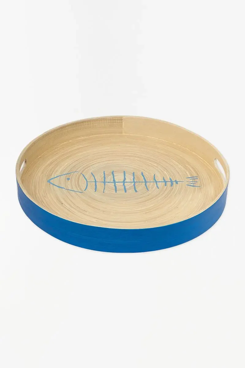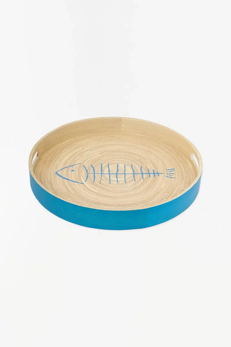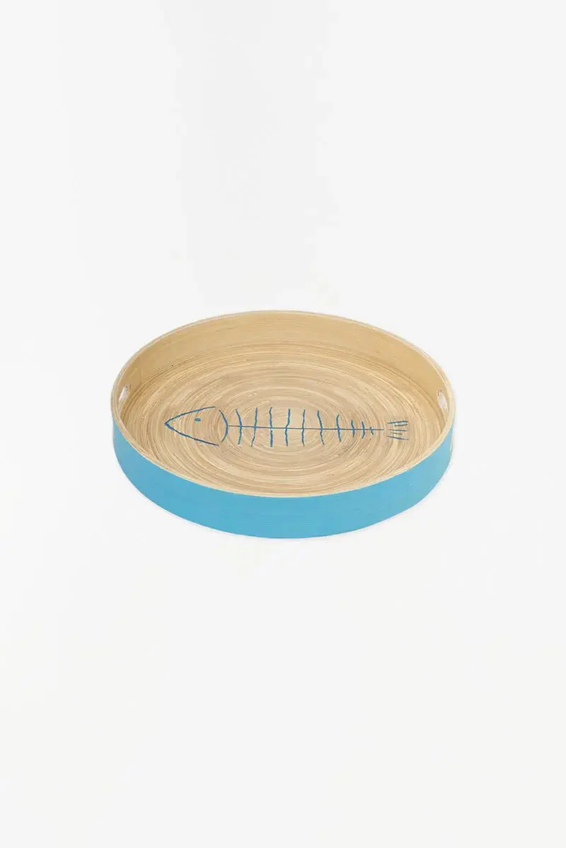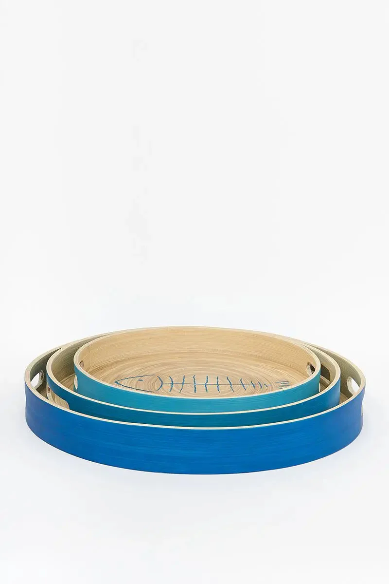 Set de 3 bandejas de bambú con espinas de peces grabadas en el interior. El interior es de bambú natural y el exterior va pintado en diferentes tonos azules.