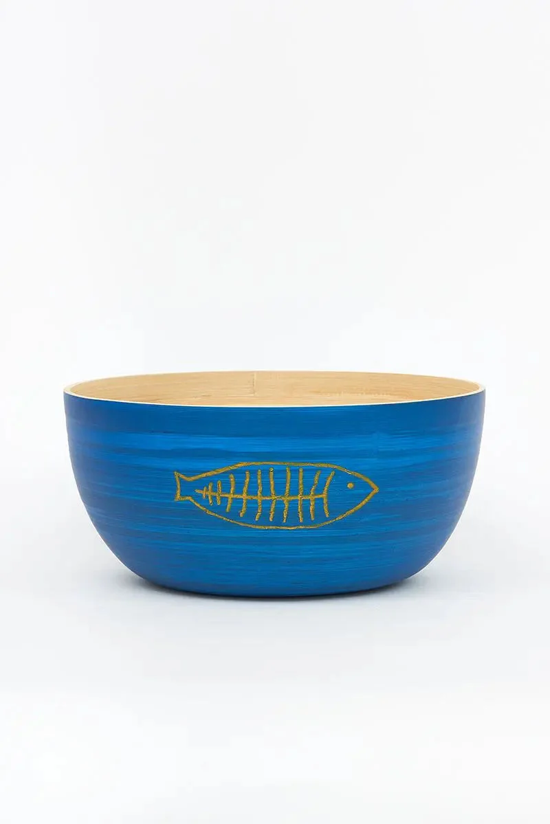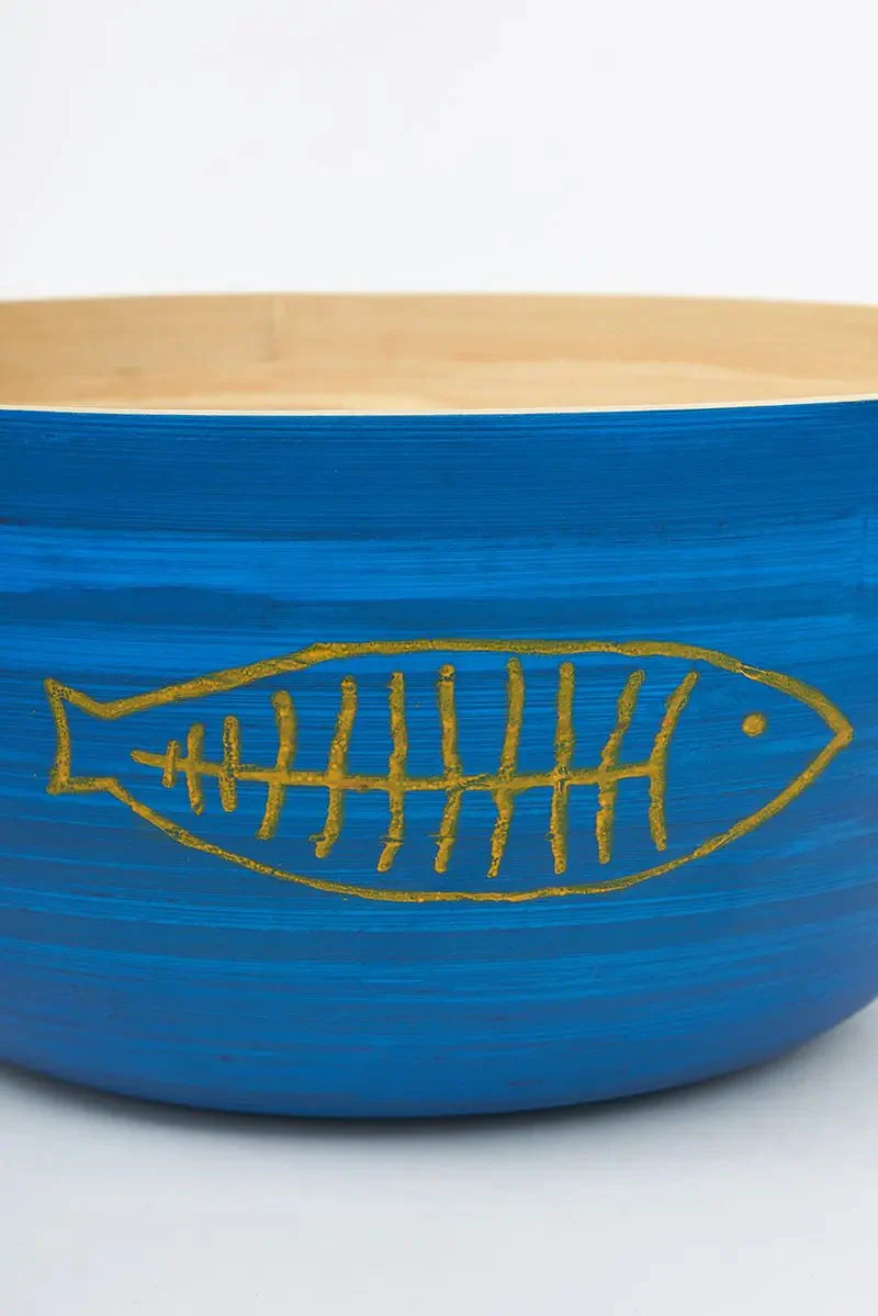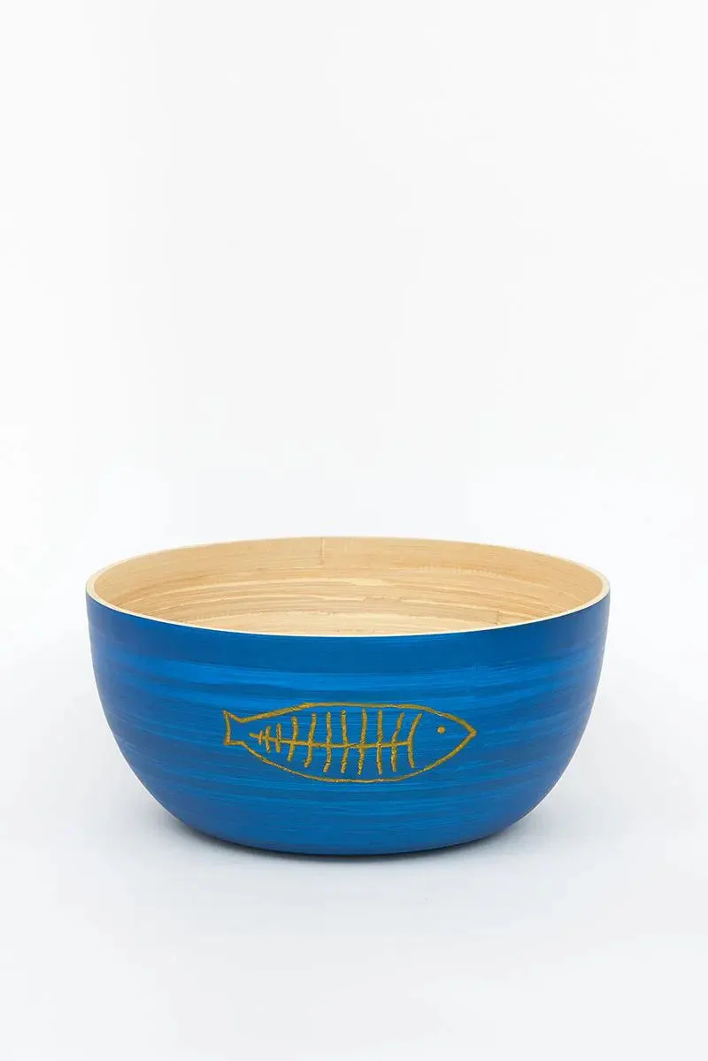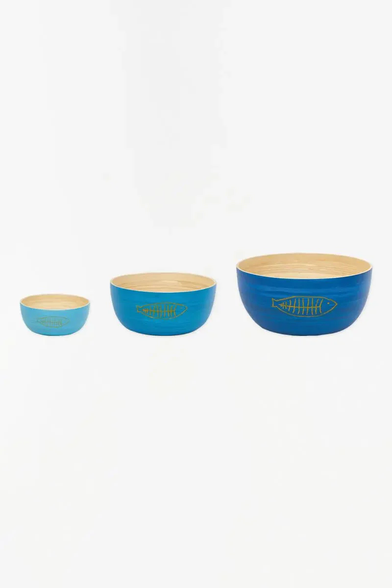 Set de 3 boles de bambú con espinas de peces grabadas en el exterior. El interior es de bambú natural y el exterior va pintado en diferentes tonos azules.