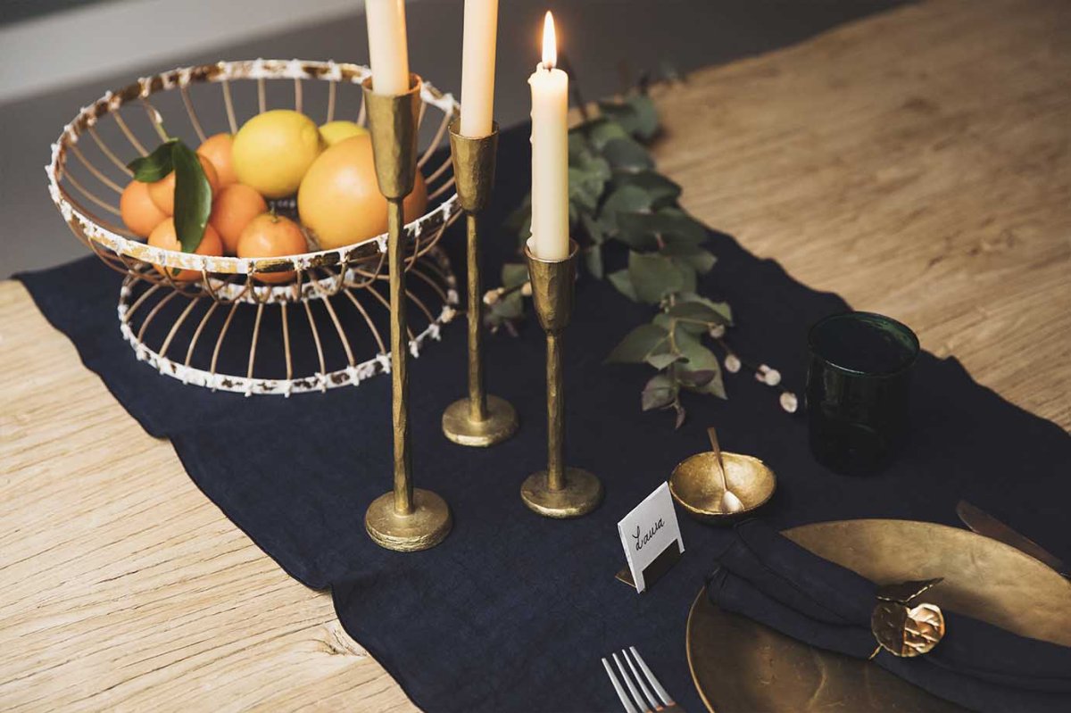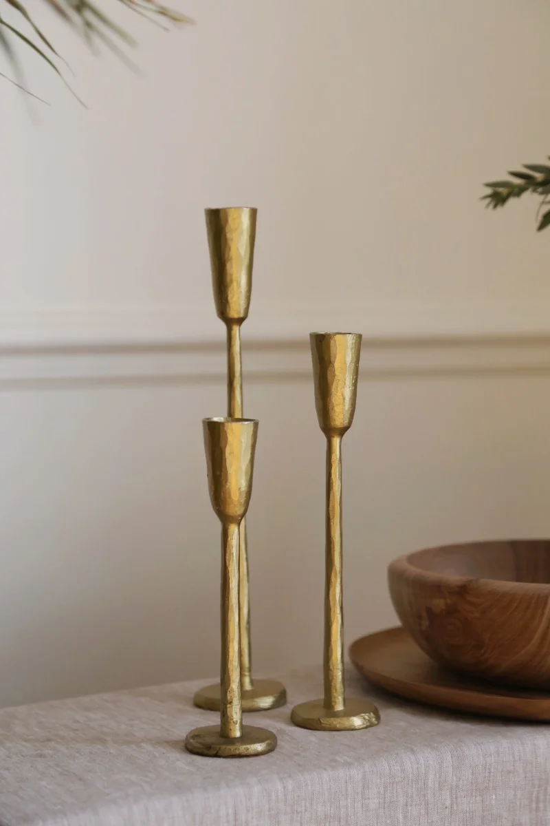 Ces bougeoirs aux formes irrégulières portent la trace du martelage qui les a forgés. Les finitions sophistiquées contrastent avec l’aspect brut de la matière. Les trois bougeoirs sont emballés dans une pochette en khadi de coton, imprimée d’une silhouette qui rappelle la finition des bougeoirs.