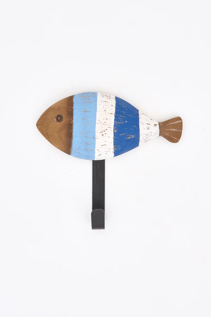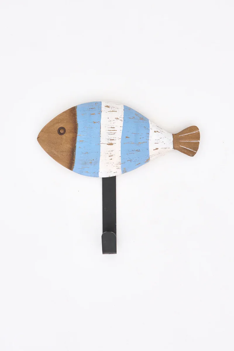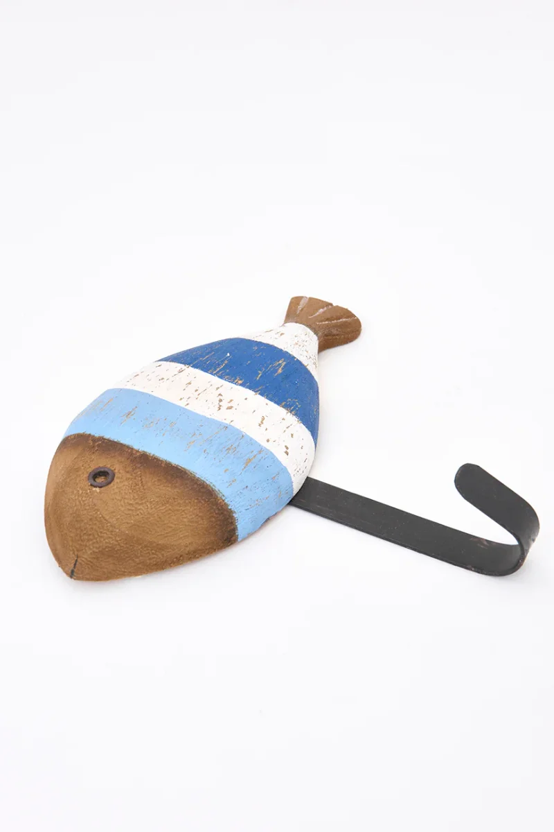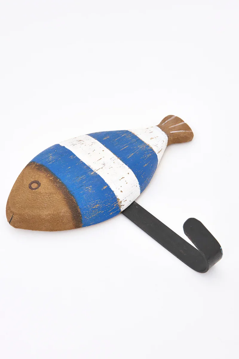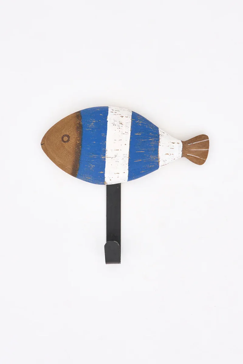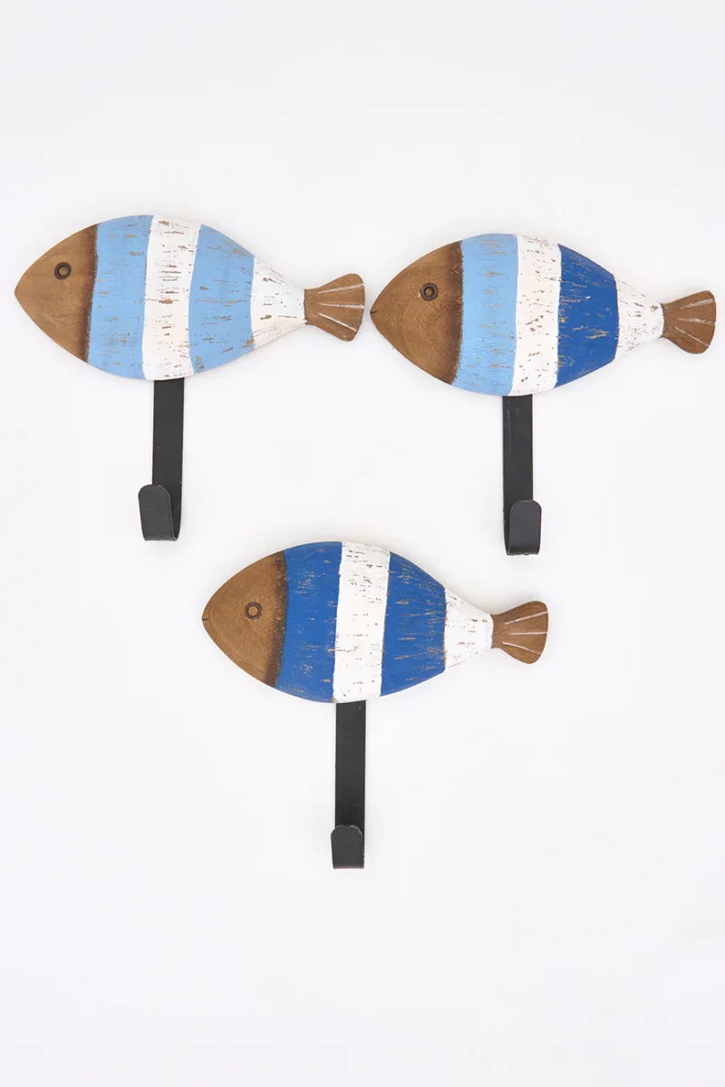 Set de tres colgadores elaborados en madera con forma de peces a rayas.