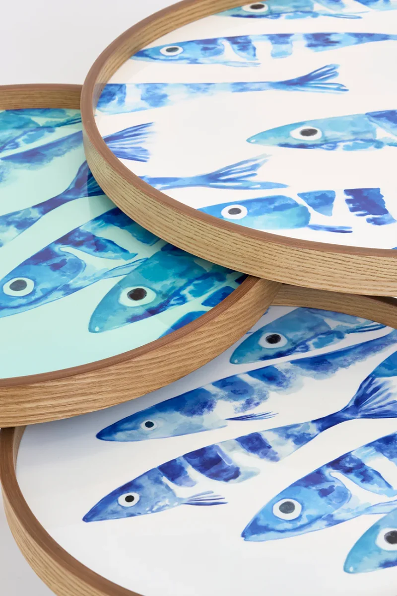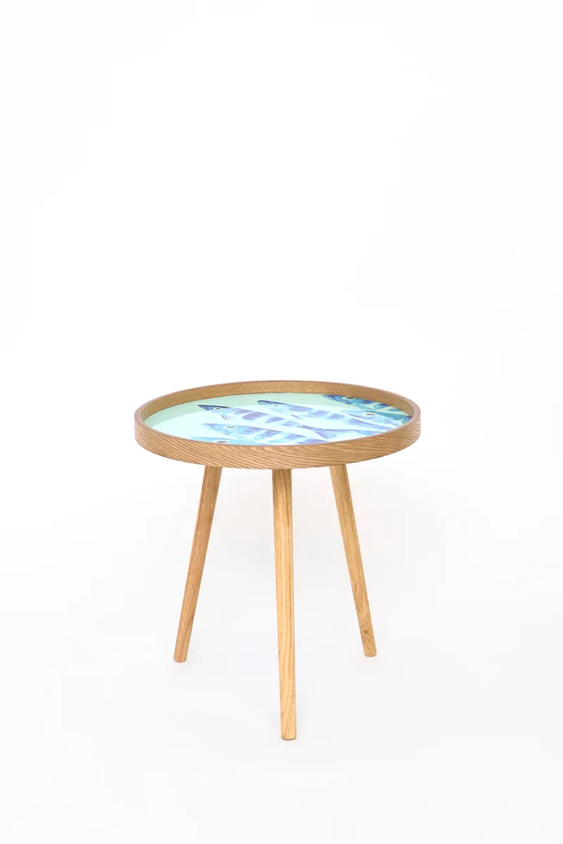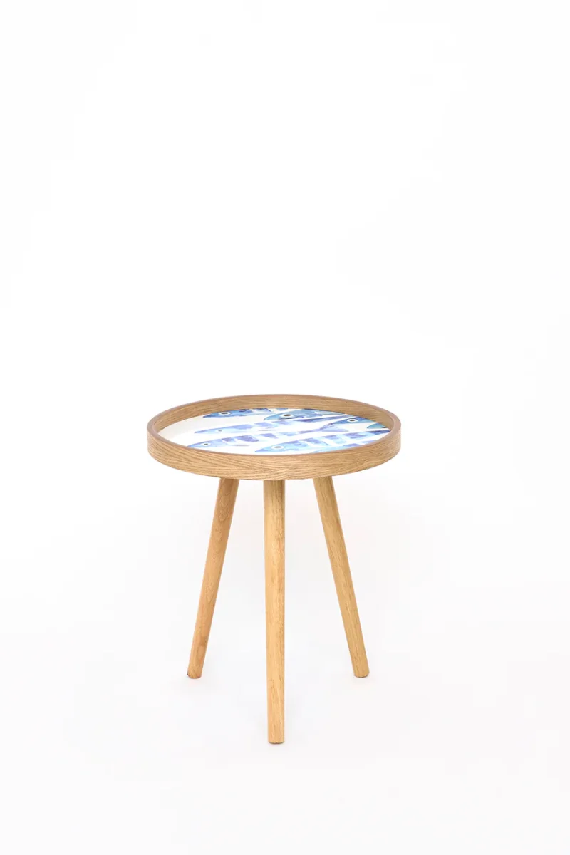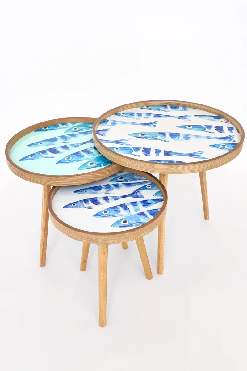 Set de tres mesas redondas de madera con la parte superior esmaltada. El sobre está decorado con un diseño de banco de peces. Las patas son desmontables, lo que facilita su transporte y almacenaje.