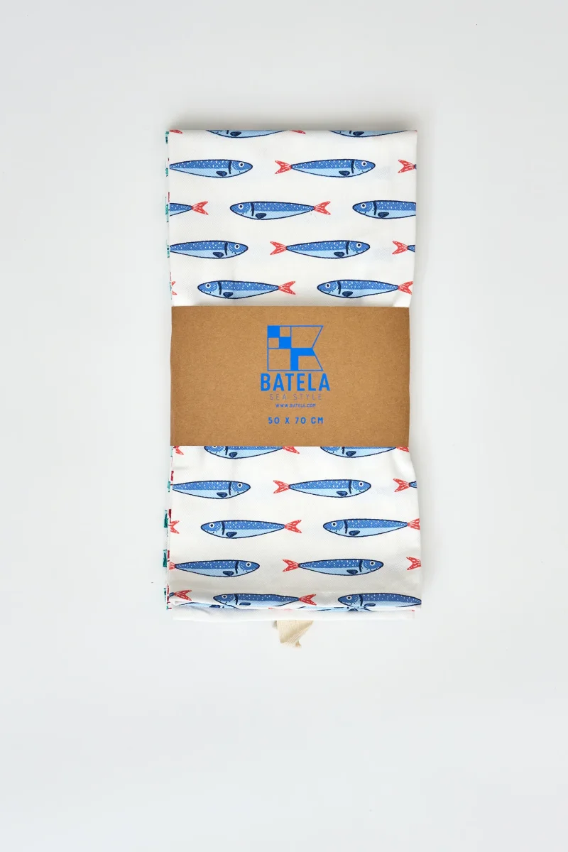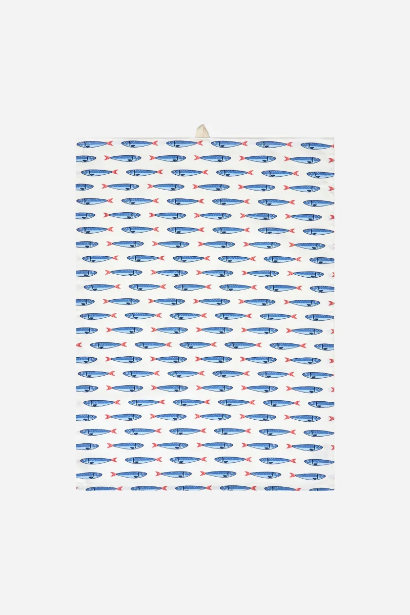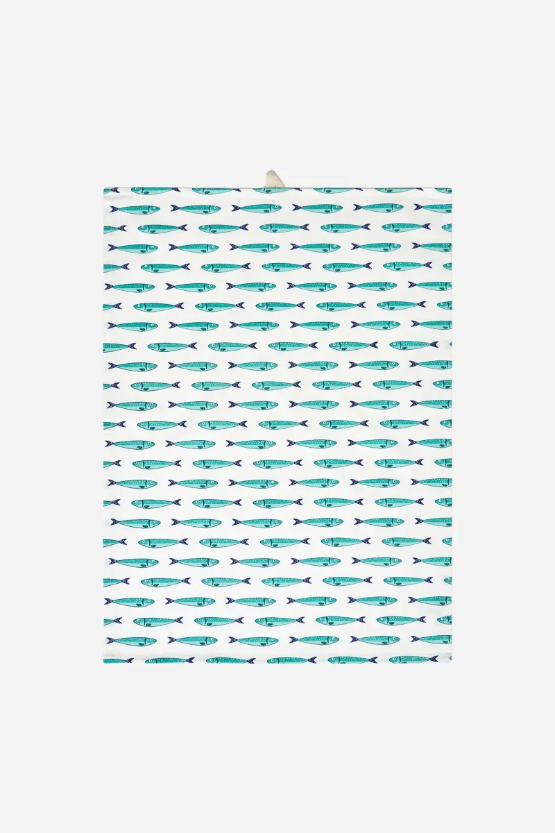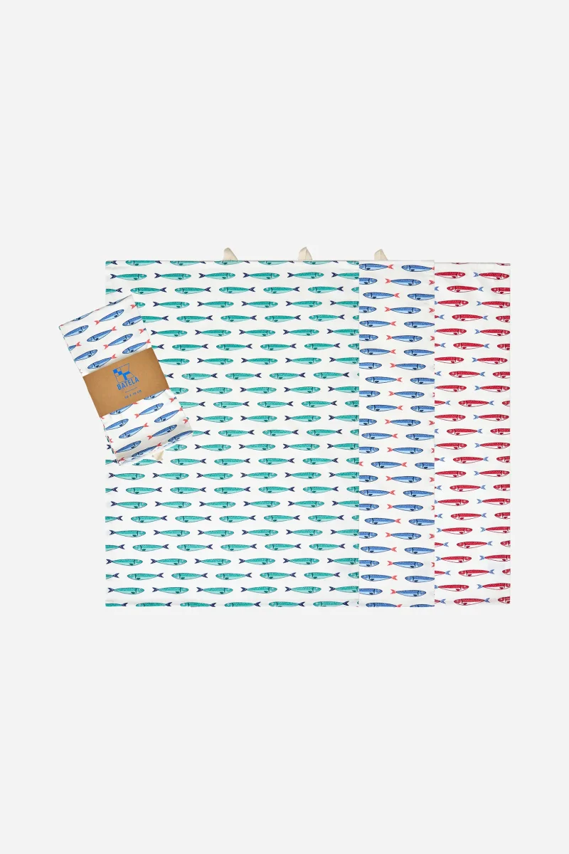 Set de paños de cocina de algodón con estampado repetido de peces en tonos marinos. Un básico funcional para el día a día que aporta un toque fresco y costero a la cocina.