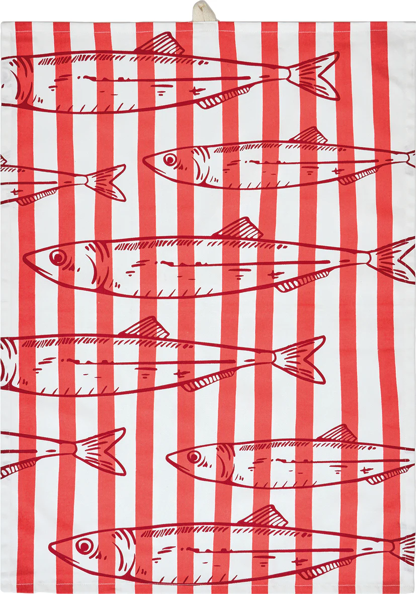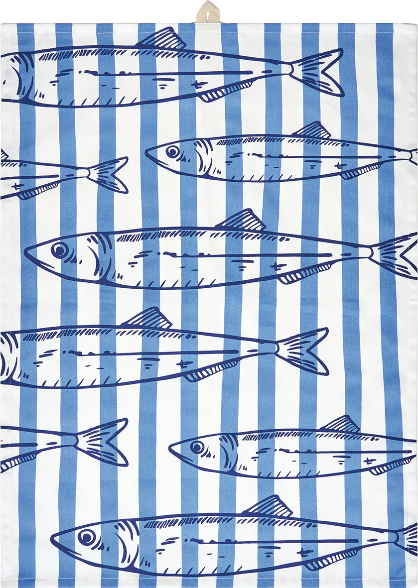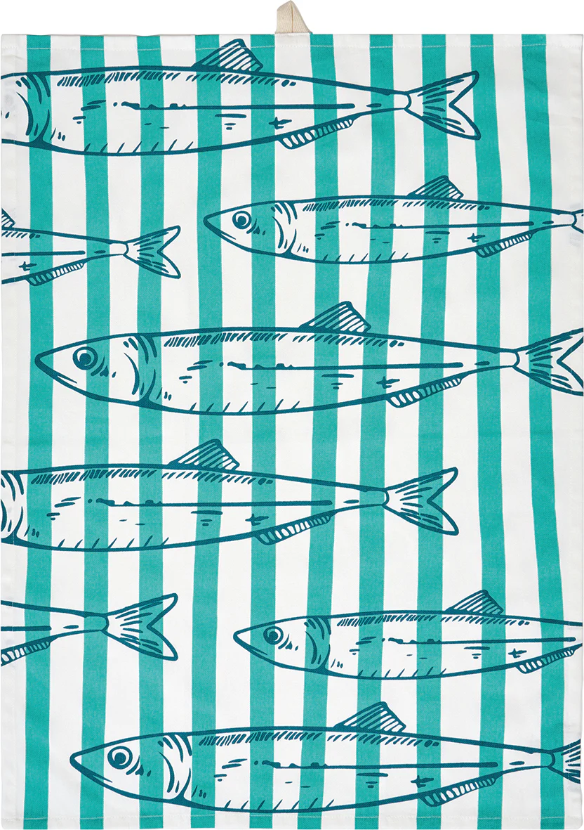Set de tres paños de cocina de algodón con estampado de peces en tonos azul, verde y coral. Un diseño fresco y marinero que aporta color y estilo costero a la cocina diaria.