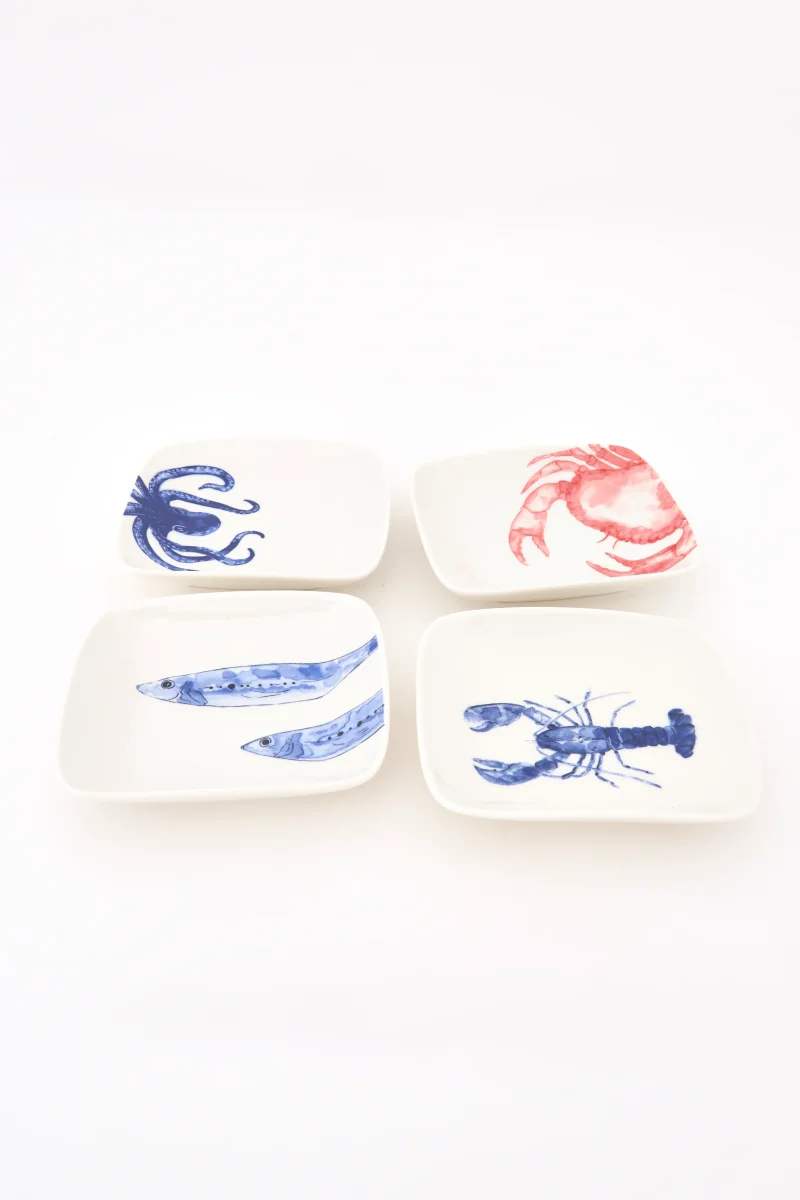 Set de cuatro platillos decorados con diferentes animales marinos.