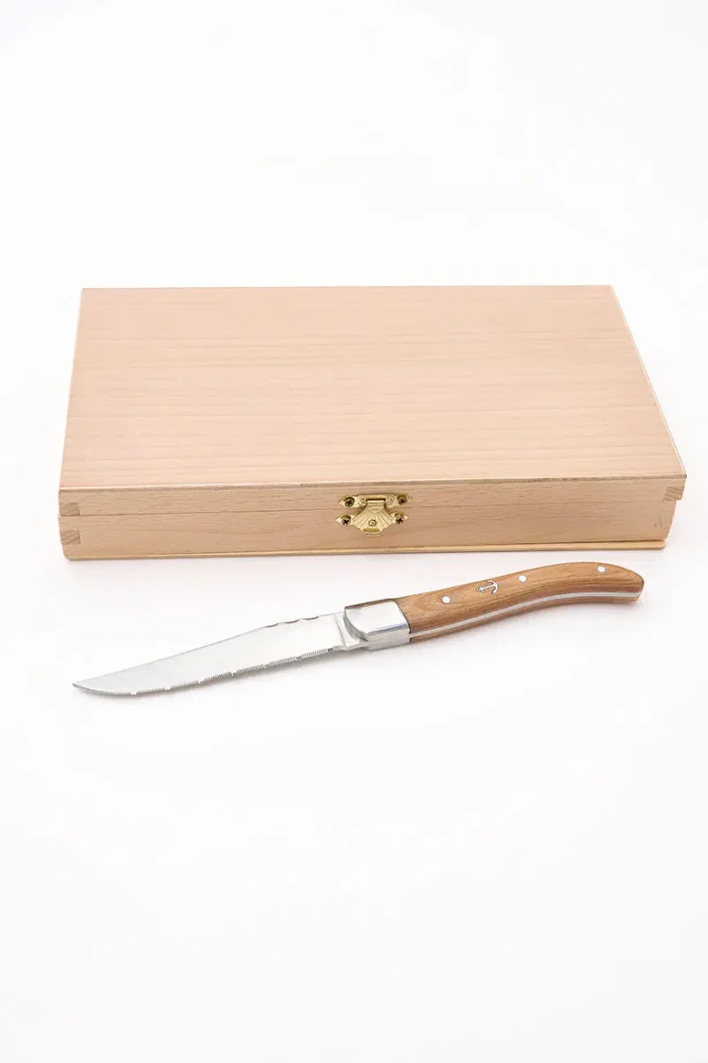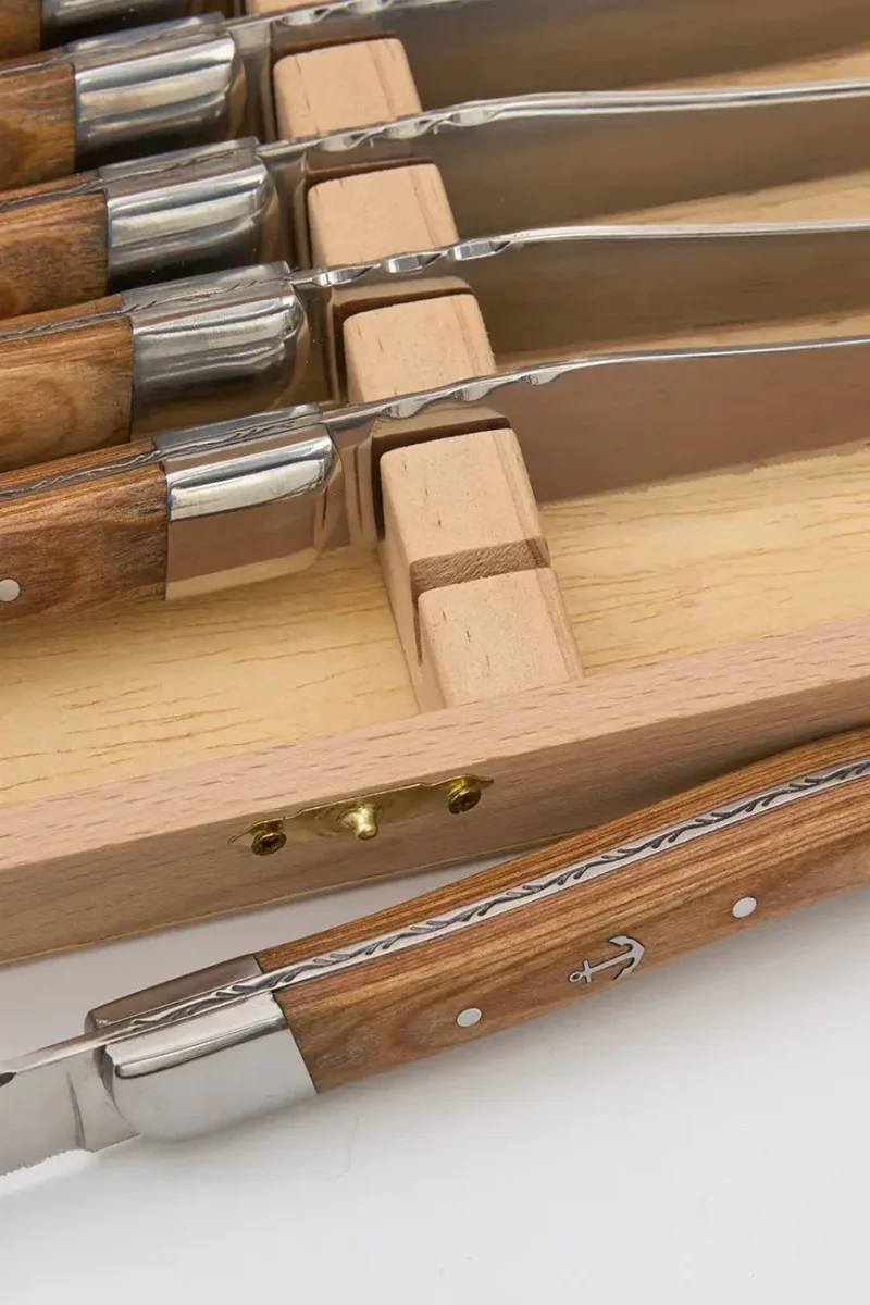 Set de 6 cuchillos con detalle de un ancla en el mango, presentados en una elegante caja de madera. Ideal para añadir un toque náutico y sofisticado a tus cenas y reuniones.