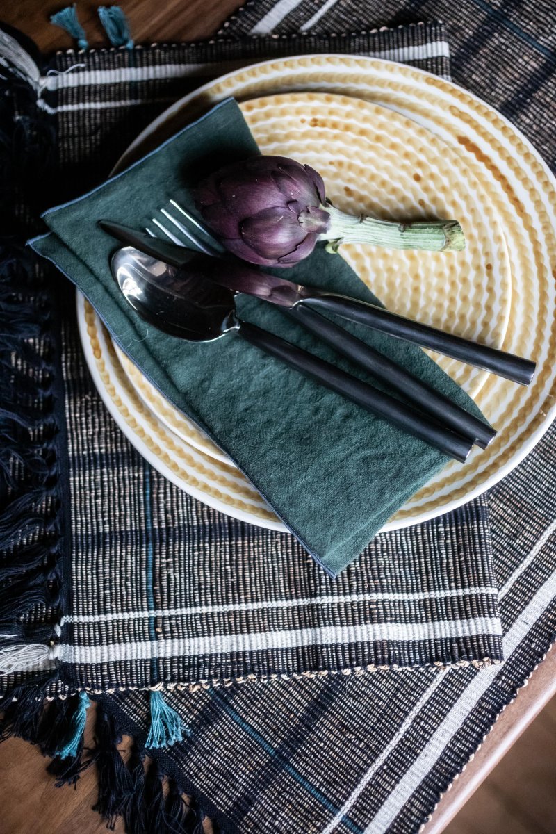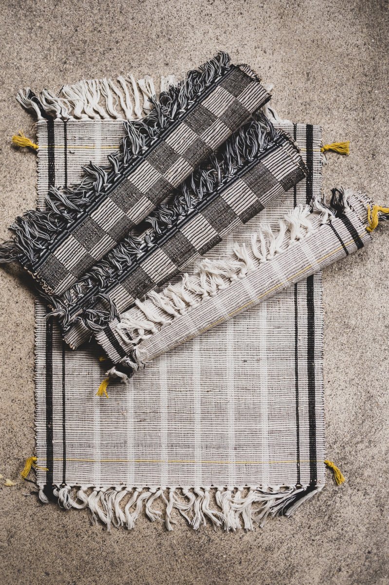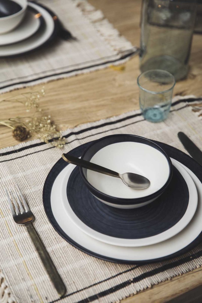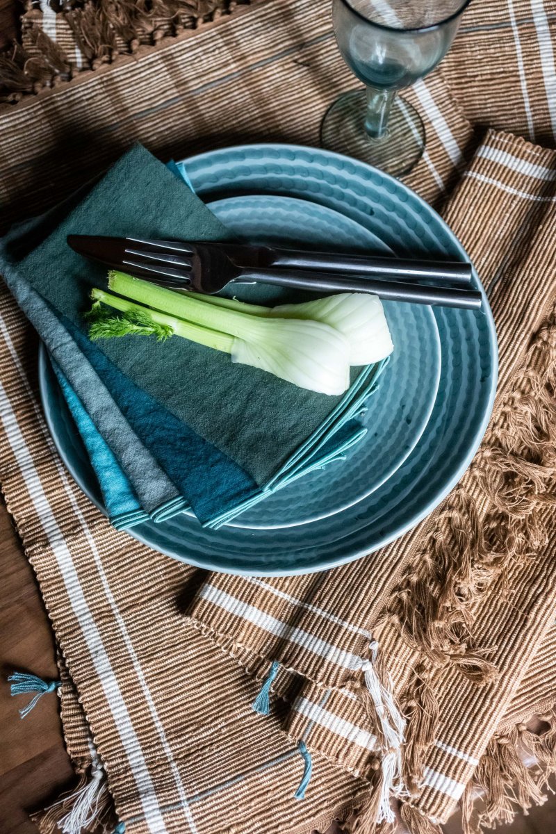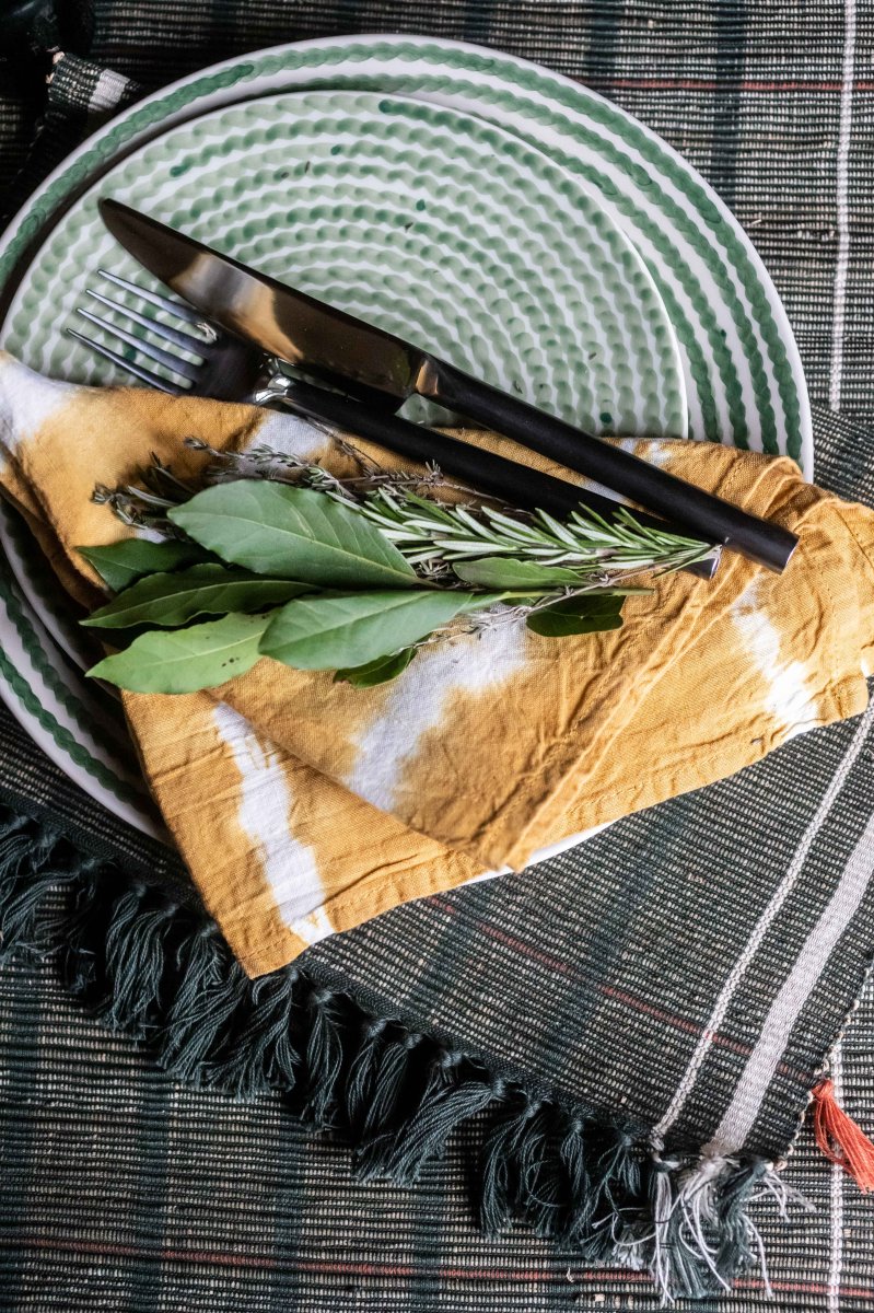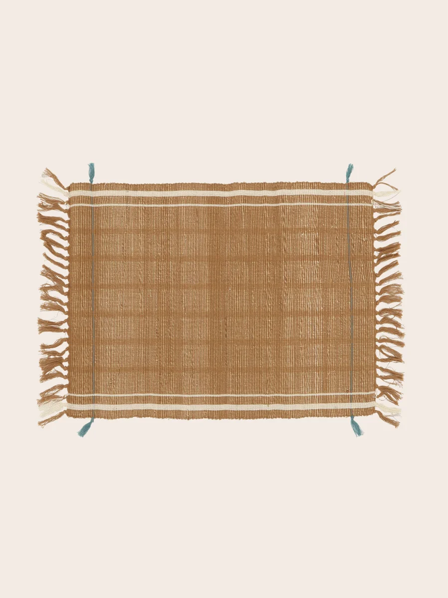 Des sets de table composés de fibres de bananier, maintenues grâce à un fil de coton patiemment noué. Chaque pièce a été confectionnée à la main sur des métiers à tisser manuels dans la région du Tamil Nadu, au Sud de l’Inde