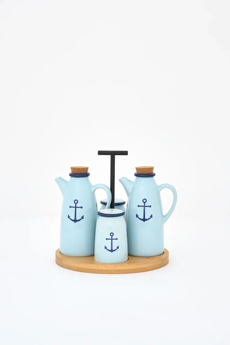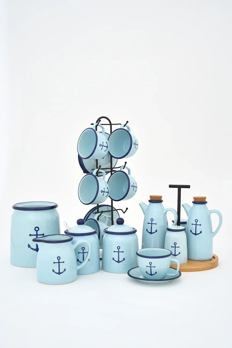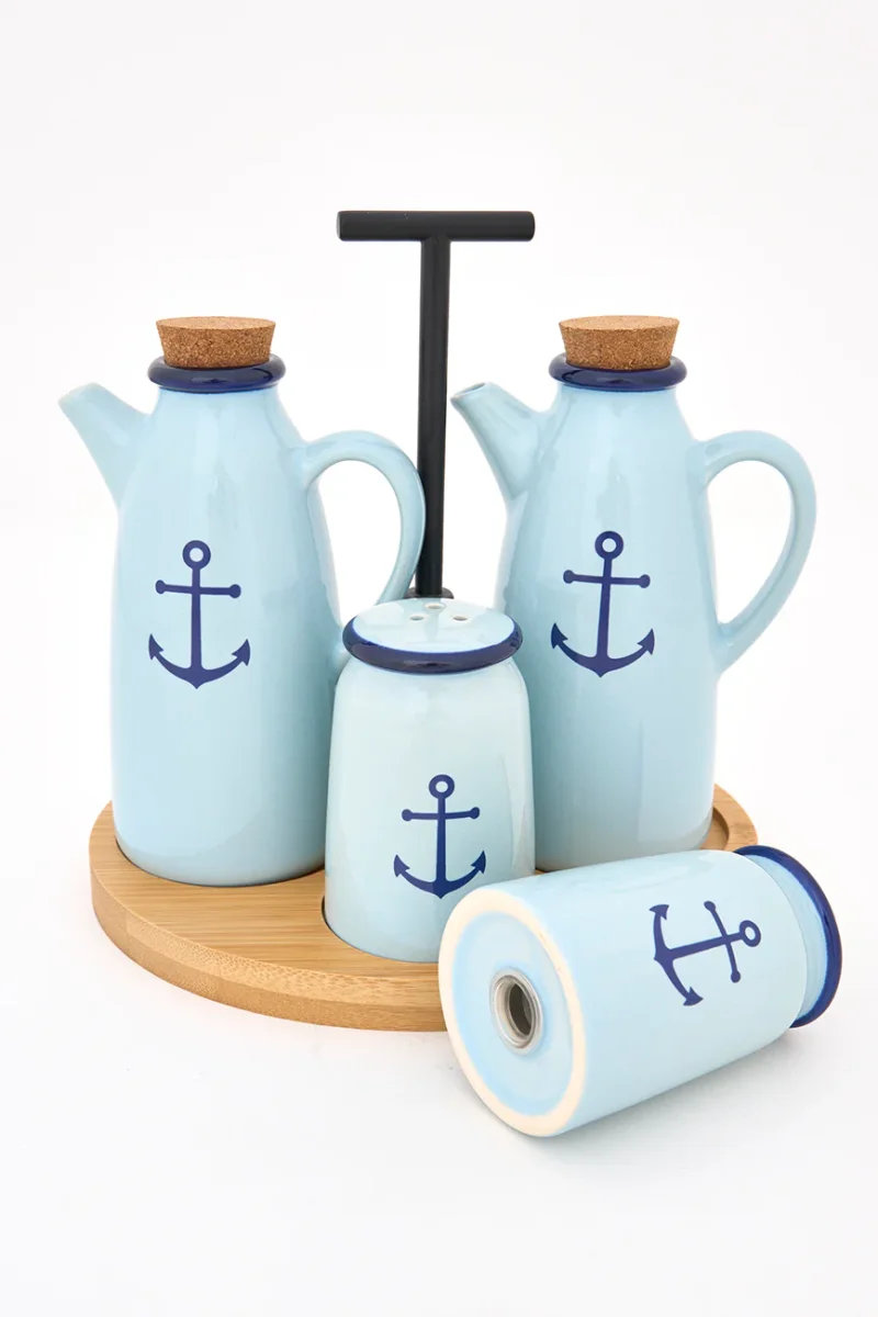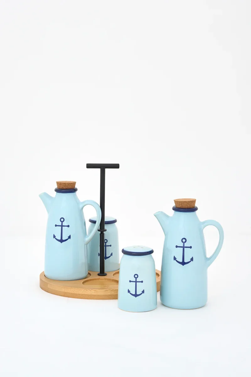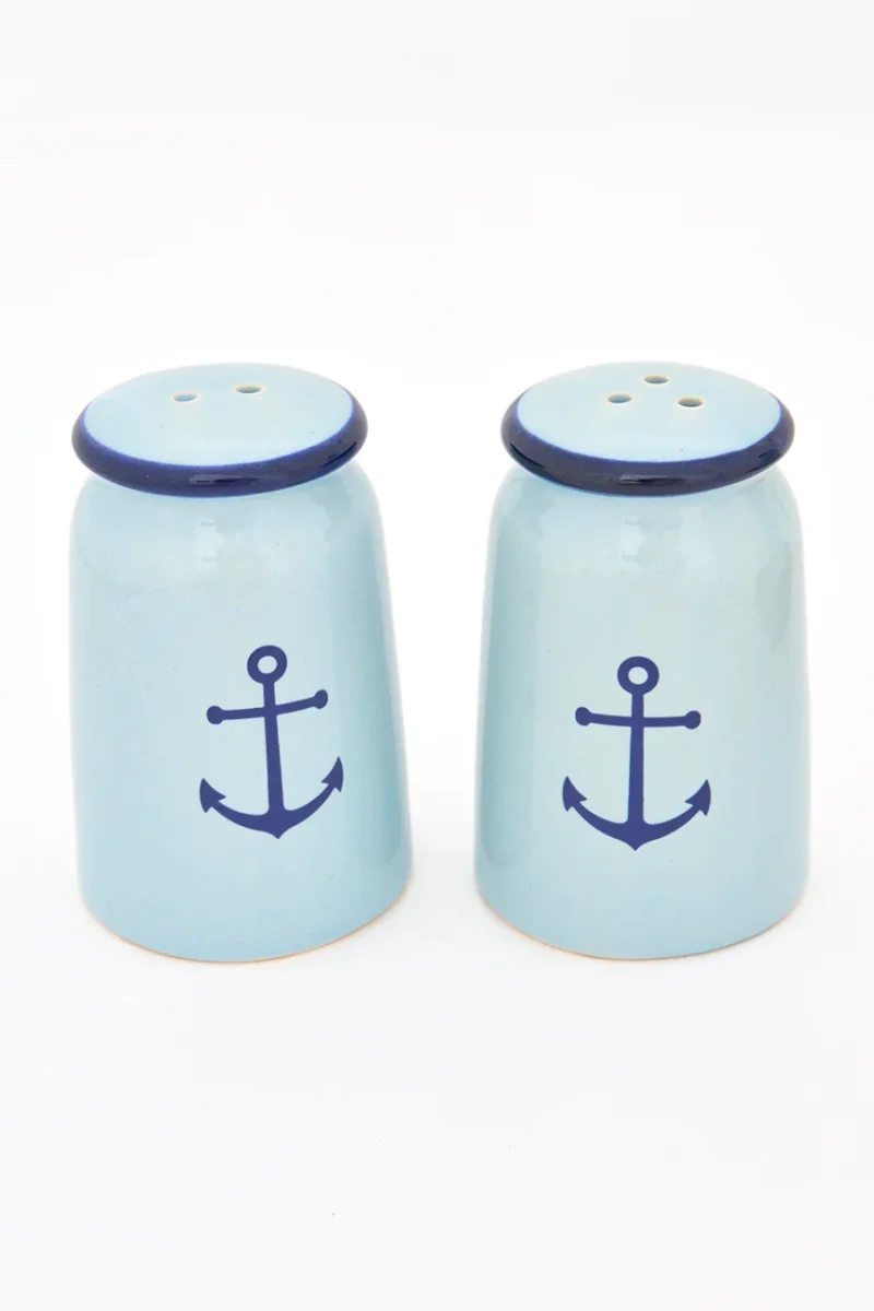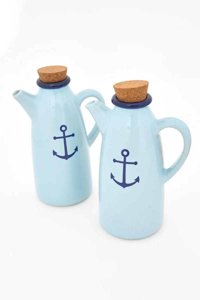 Set para ensaladas pintado en color azul pastel y decorado con un ancla en azul marino. Forma parte de una colección a juego con tazas, platillos y otros botes. Un complemento práctico con estilo marinero y aire vintage.