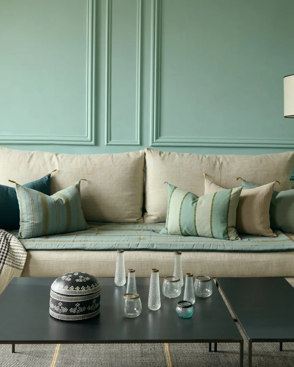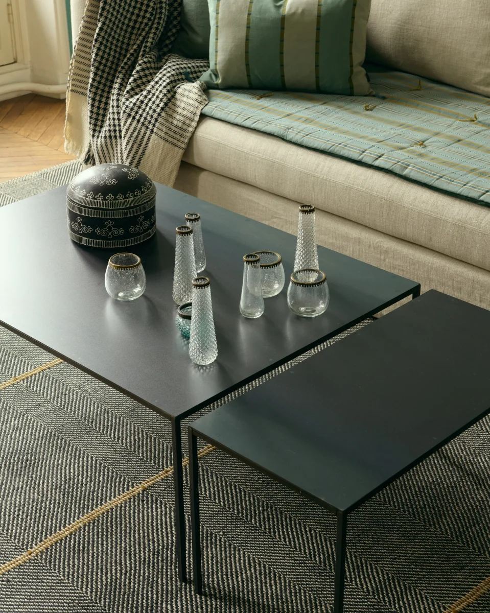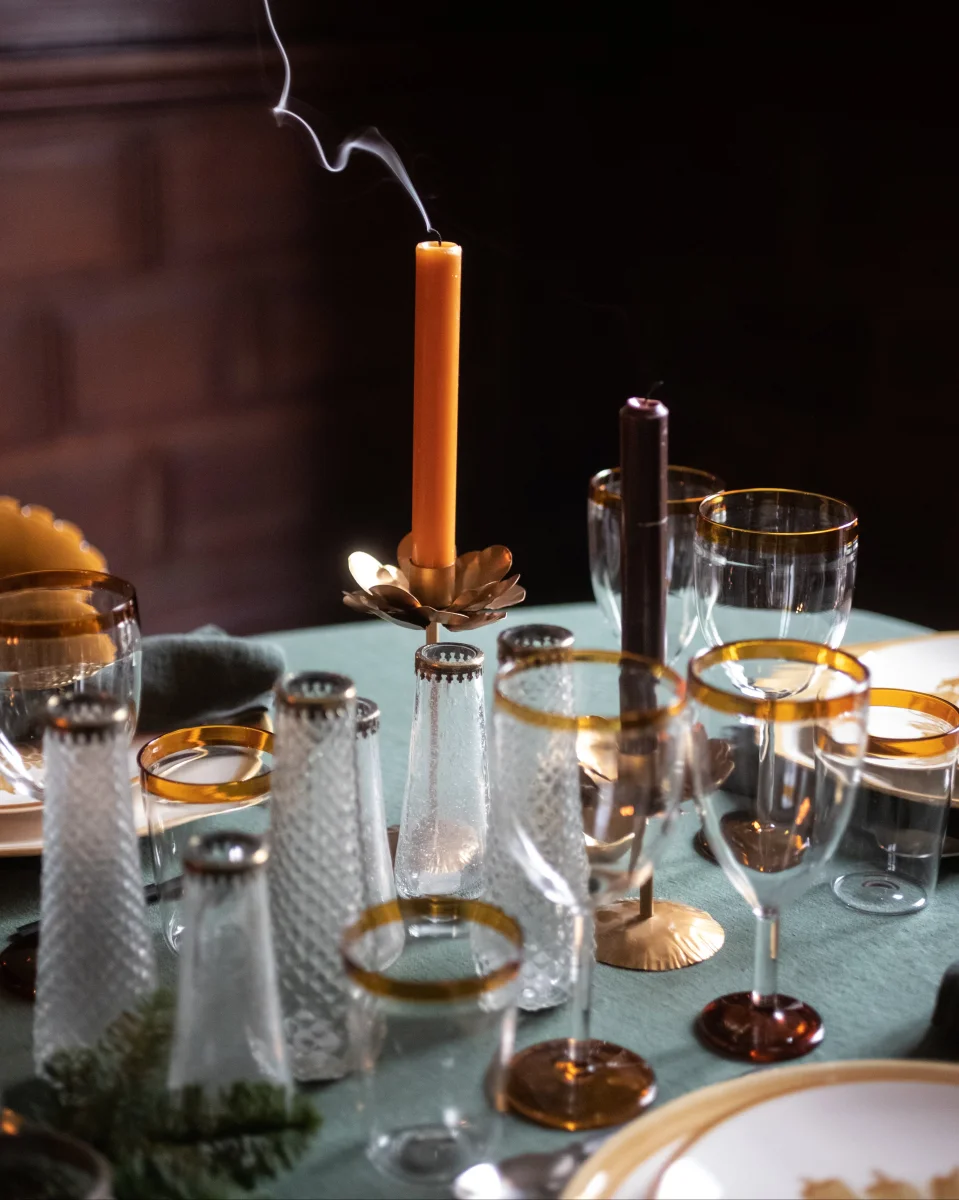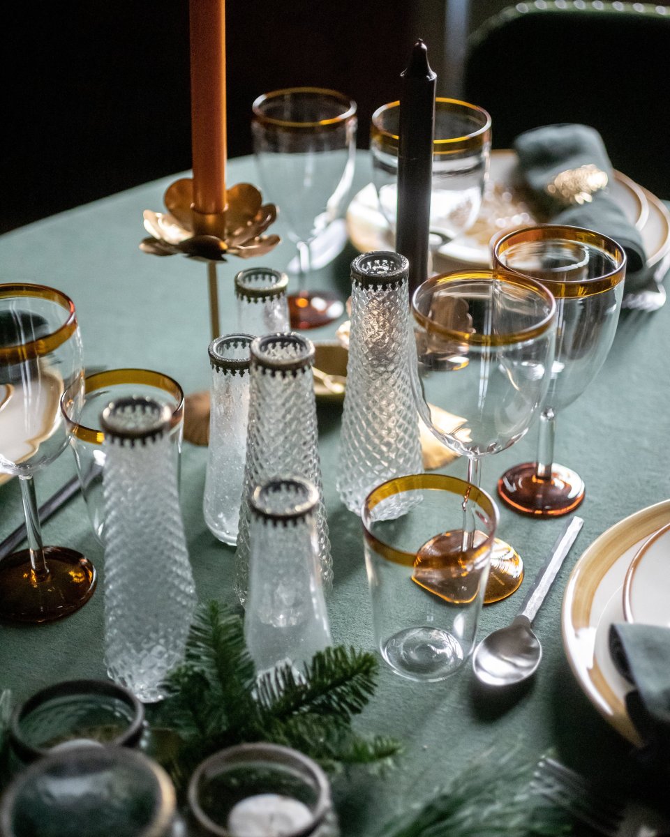 La ligne Hera est entièrement soufflée à la bouche et façonnée à la main en verre recyclé. Chaque pièce est ensuite finalisée par une bague en laiton à motif dentelé, signature de la collection, qui souligne leur caractère artisanal.