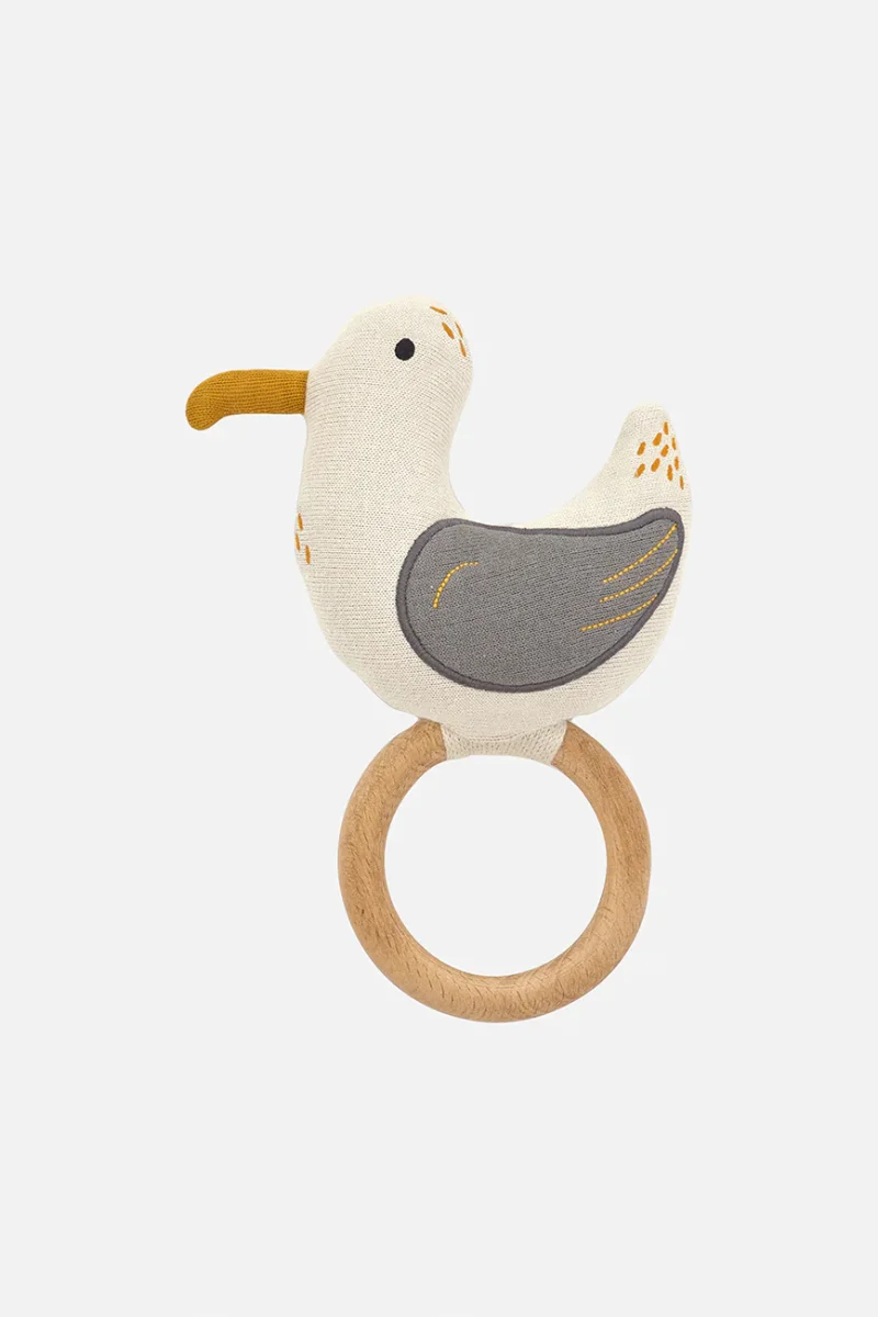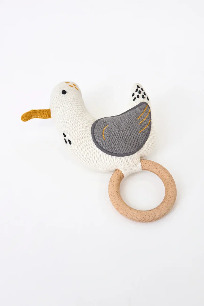 Sonajero con una gaviota de peluche incorporada. Suave y agradable al tacto, pensado para acompañar al bebé. Un complemento tierno y práctico para los primeros meses.