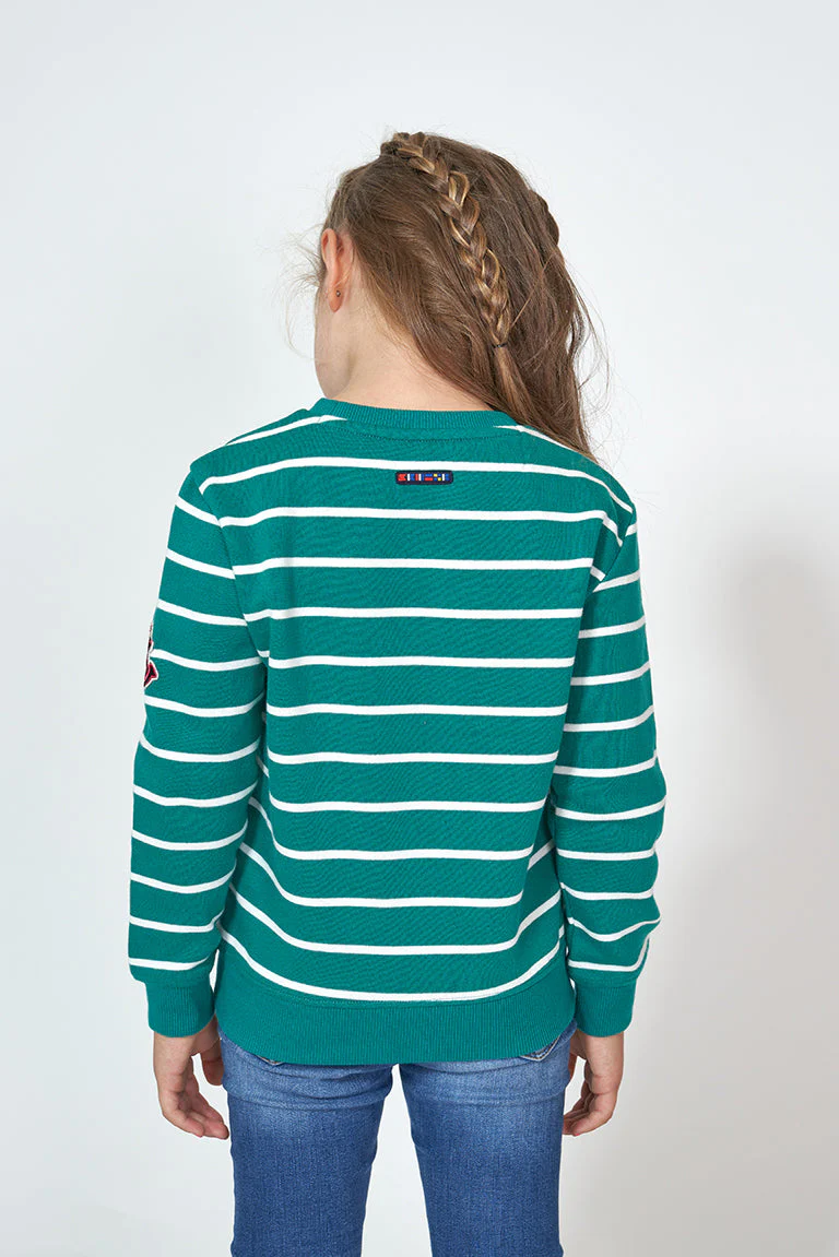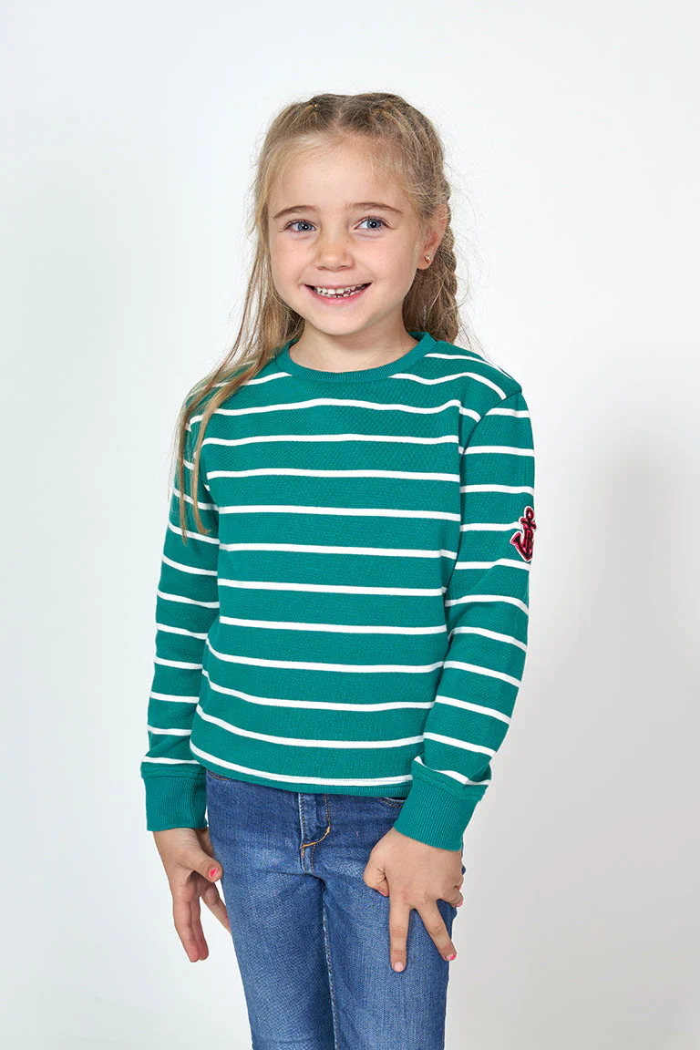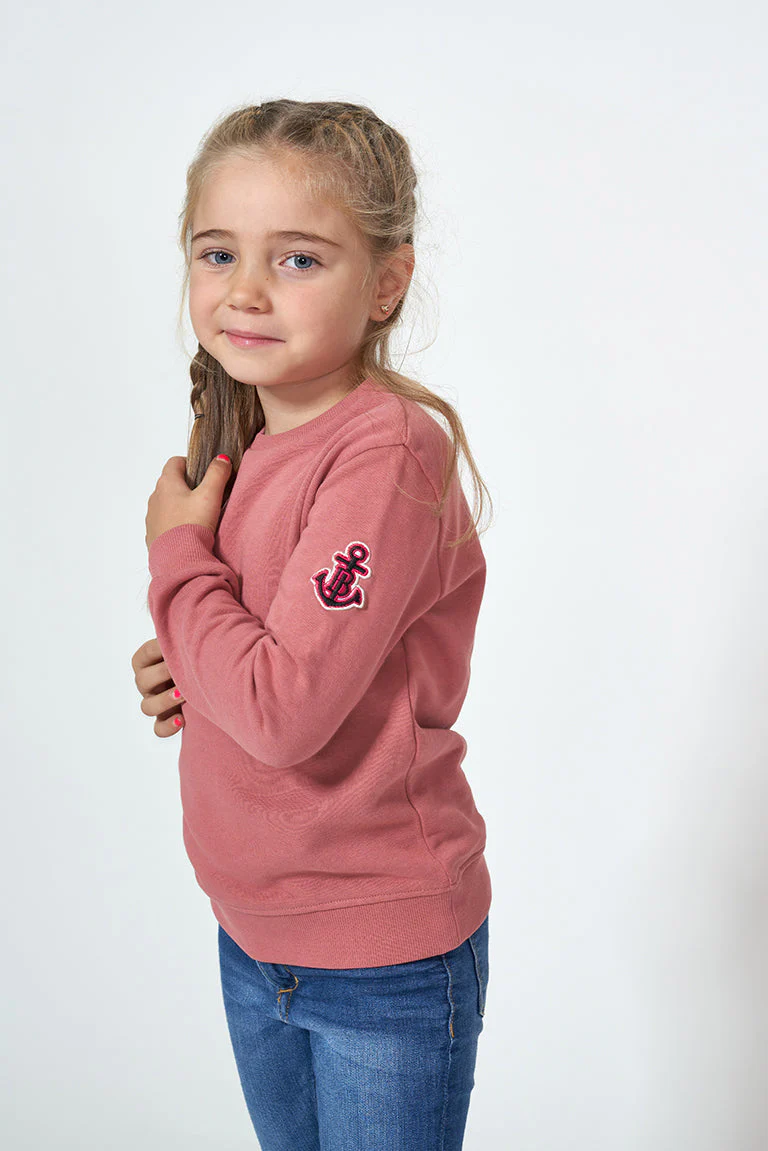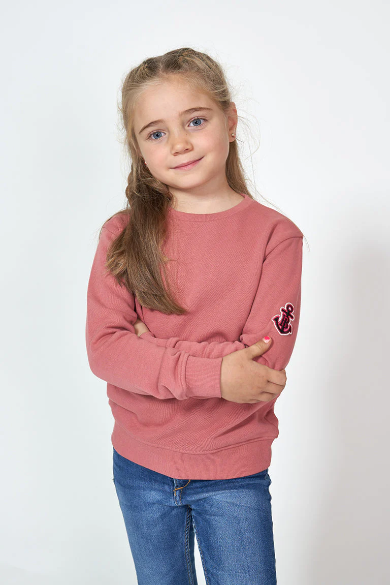 Sudadera para niña o niño fabricada en tejido de felpa, con estampado de rayas o liso. Tiene un parche en forma de ancla en el brazo y remate elástico de canalé en cuello, puños y bajo. La felpa está cepillada en el interior aportando calidez, comodidad y suavidad extra en la prenda.