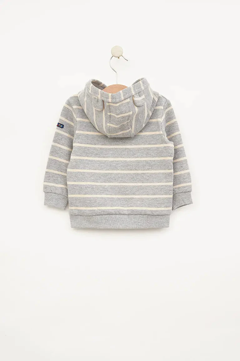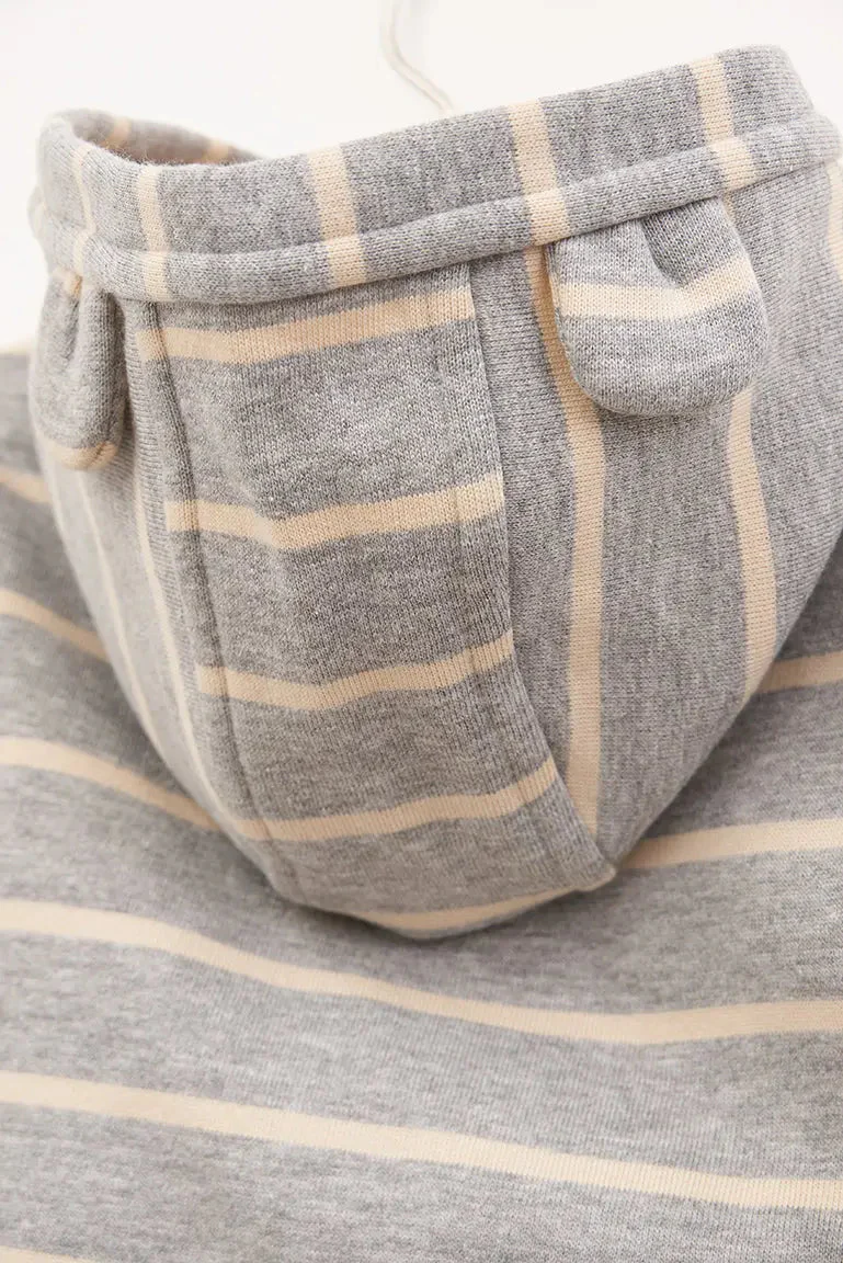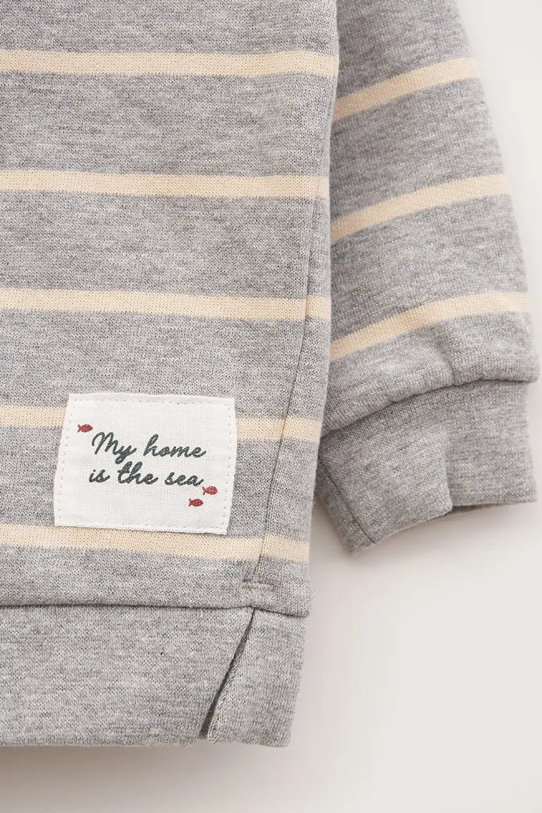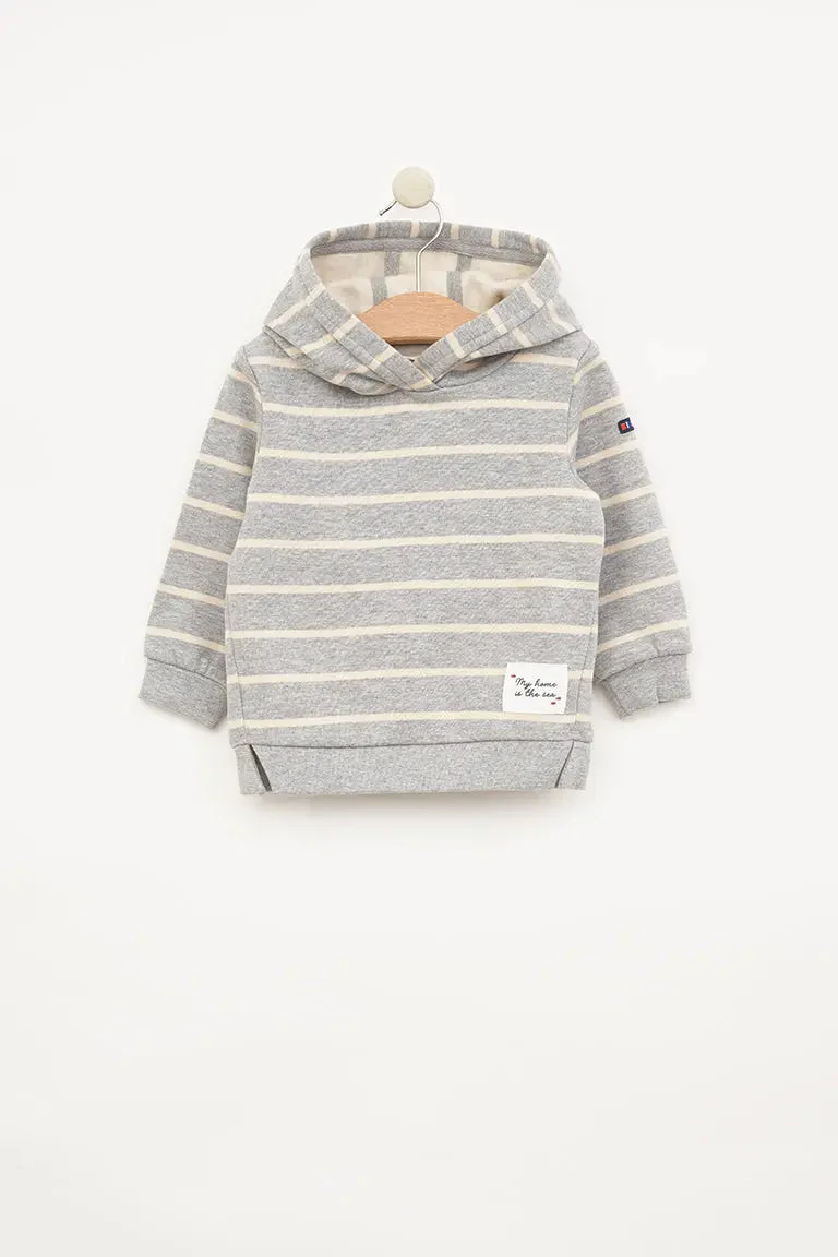 Sudadera marinera a rayas con capucha. Está confeccionada en tejido Terry 100% algodón. Lleva una pequeña etiqueta en la cintura con dibujos de peces y el texto ‘My home is the sea’.