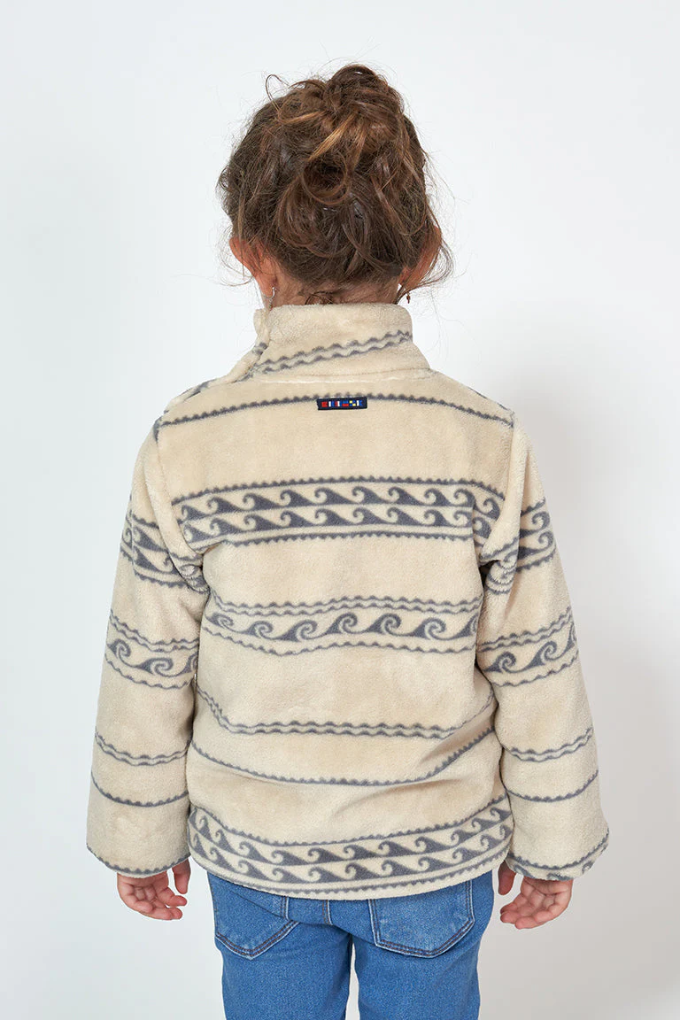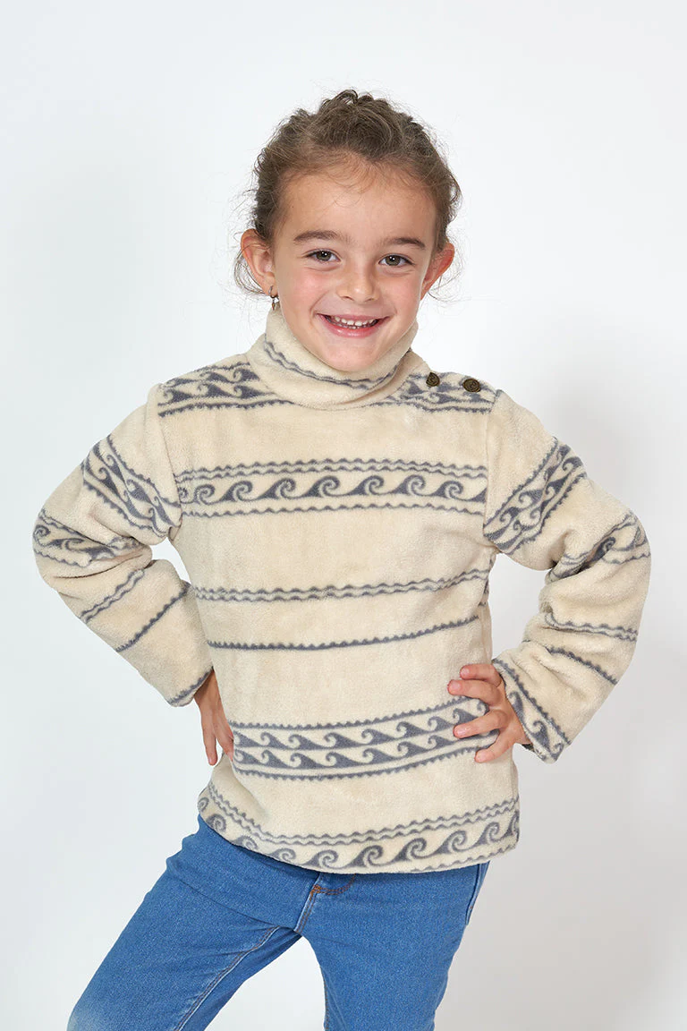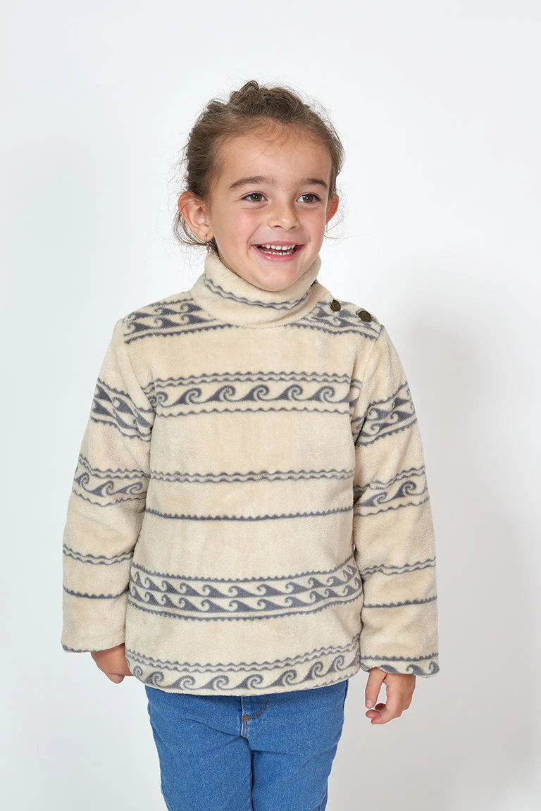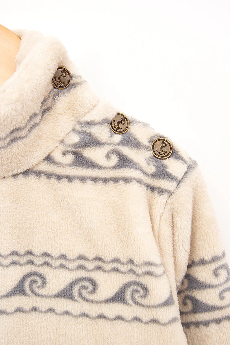 Sudadera para niña o niño fabricada en tejido teddy polar. Esta prenda es de cuello elevado, con abertura en el lado del cuello y hombre qu se cierra con botones con detalles de anclas. El bajo y las mangas con elásticas.