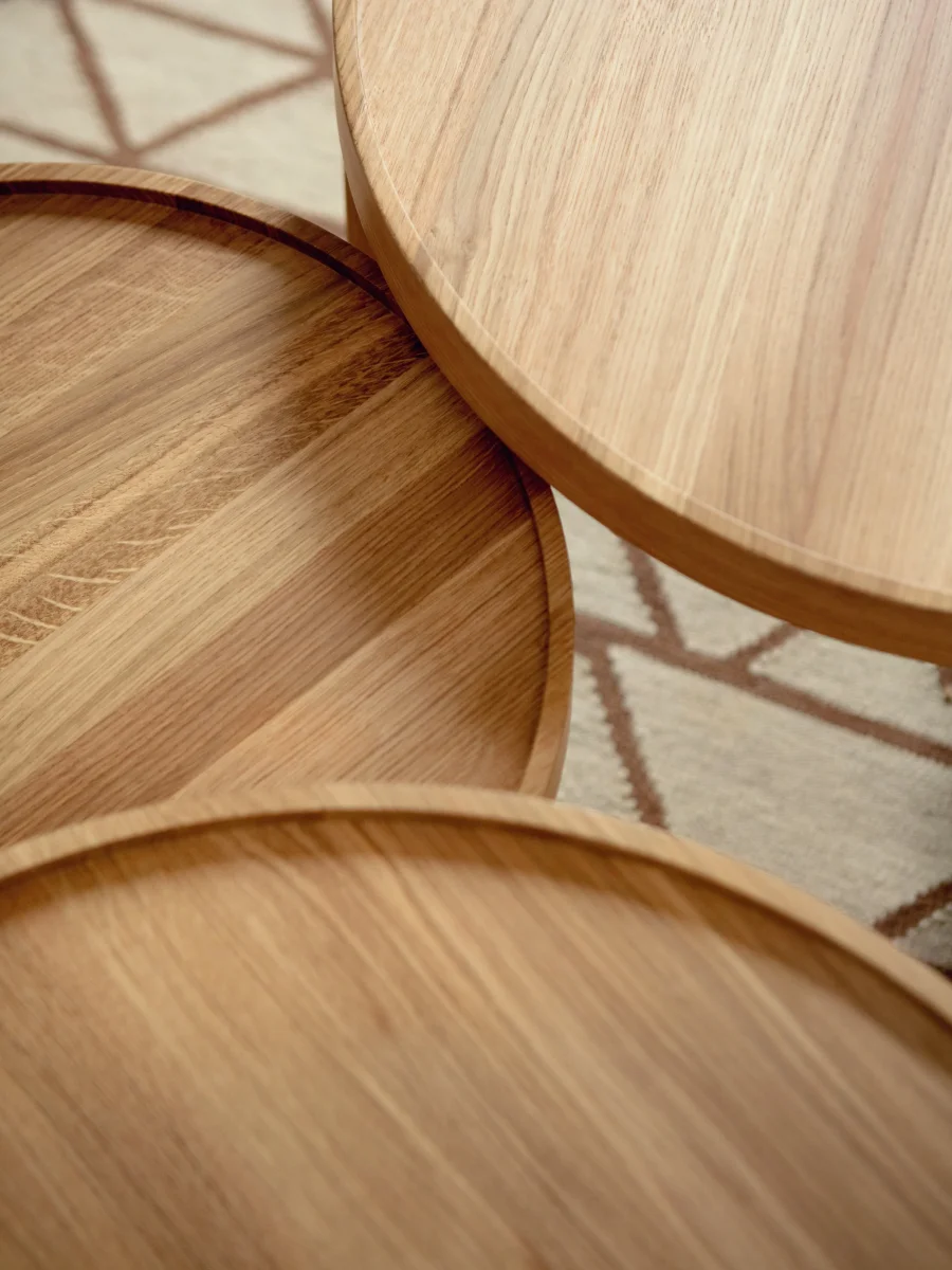 Ici, tout est dans la forme : des courbures et des arrondis qui se répondent et s’emboîtent en douceur. Le plateau, en chêne massif, est creusé avec finesse pour former un rebord délicat.