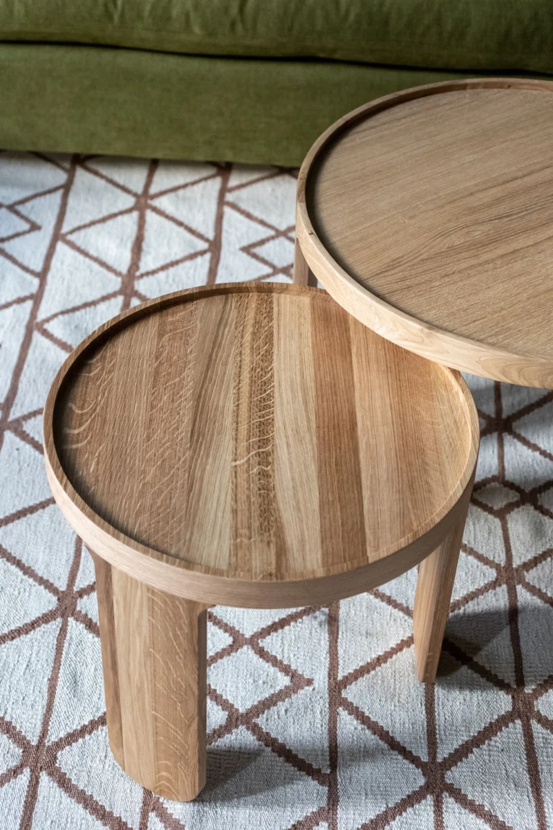 Ces deux tables gigognes en chêne massif sont conçues pour agrémenter un bout de canapé, former un ensemble de tables basses, ou jouer le rôle de table d’appoint.