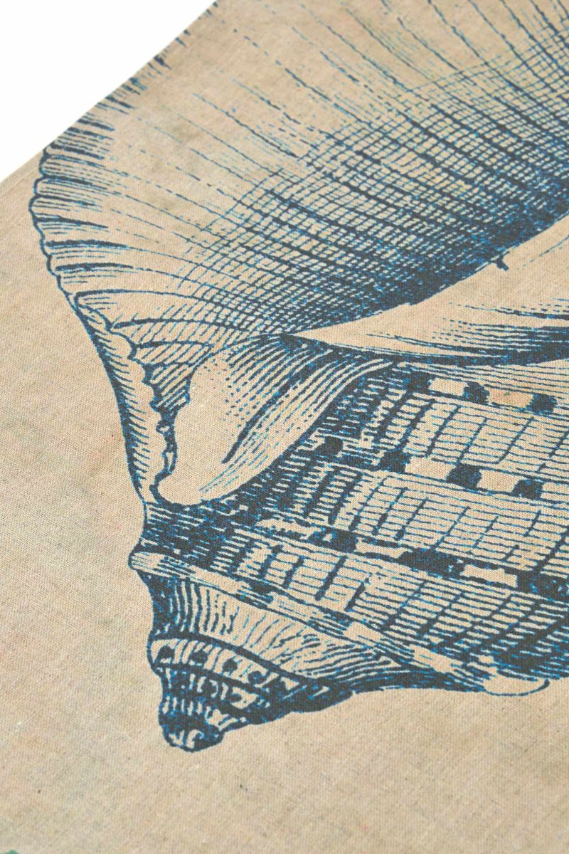 Tapiz textil con ilustraciones de conchas en tonos azules sobre fondo natural.