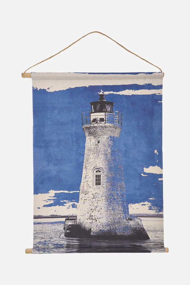 Tapiz textil con ilustración de faro sobre fondo azul de inspiración marinera.