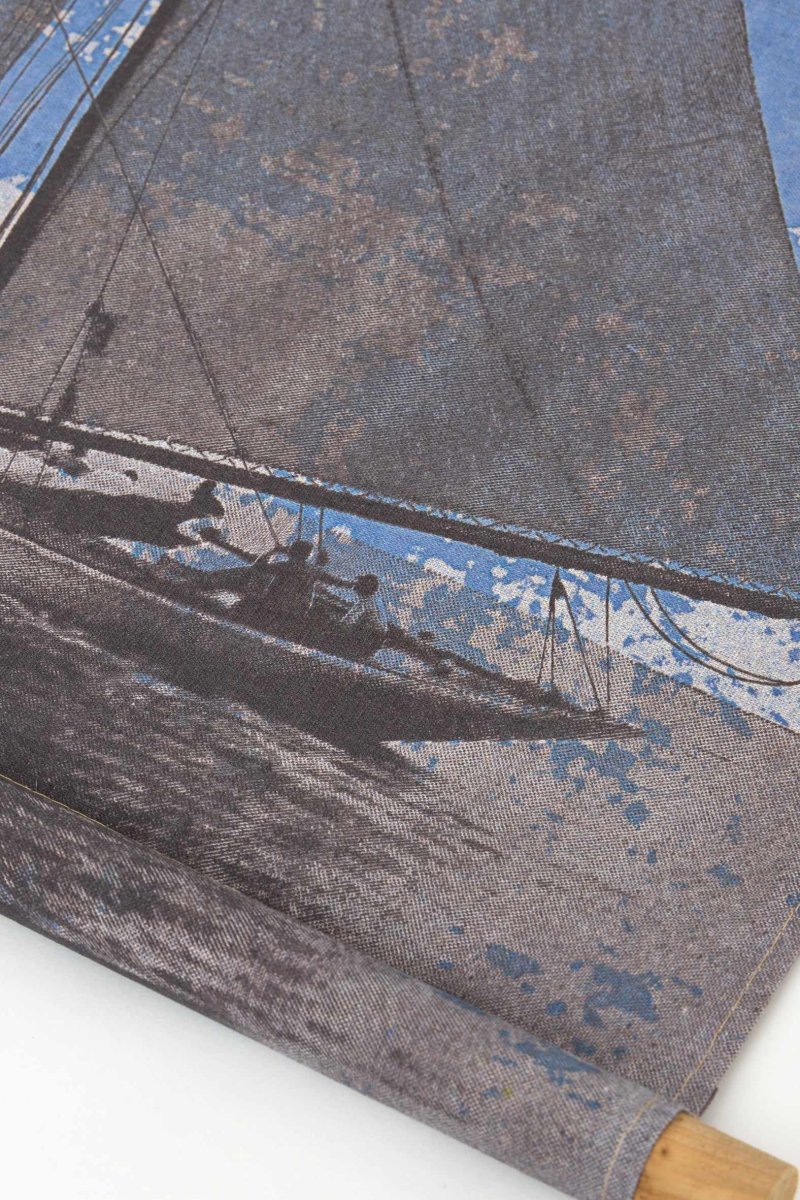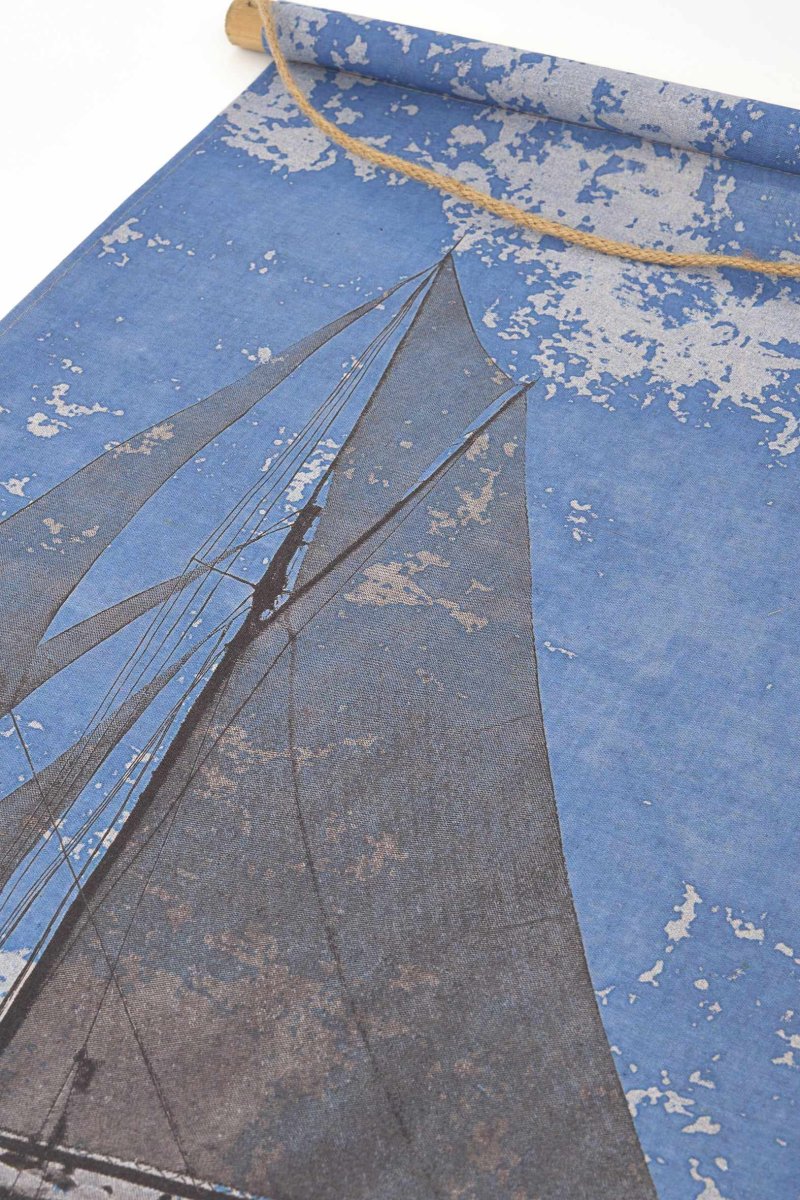 Tapiz textil con ilustración de velero en tonos azules y acabado efecto envejecido. Con varillas de madera y cuerda, perfecto para una decoración marinera.