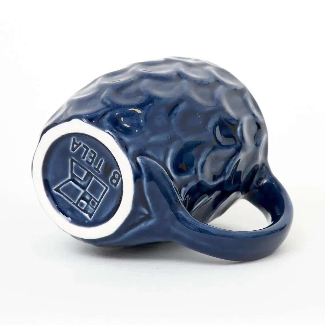 Taza azul con una textura que simula las escamas de un pez. Artículo práctico y decorativo al mismo tiempo.
