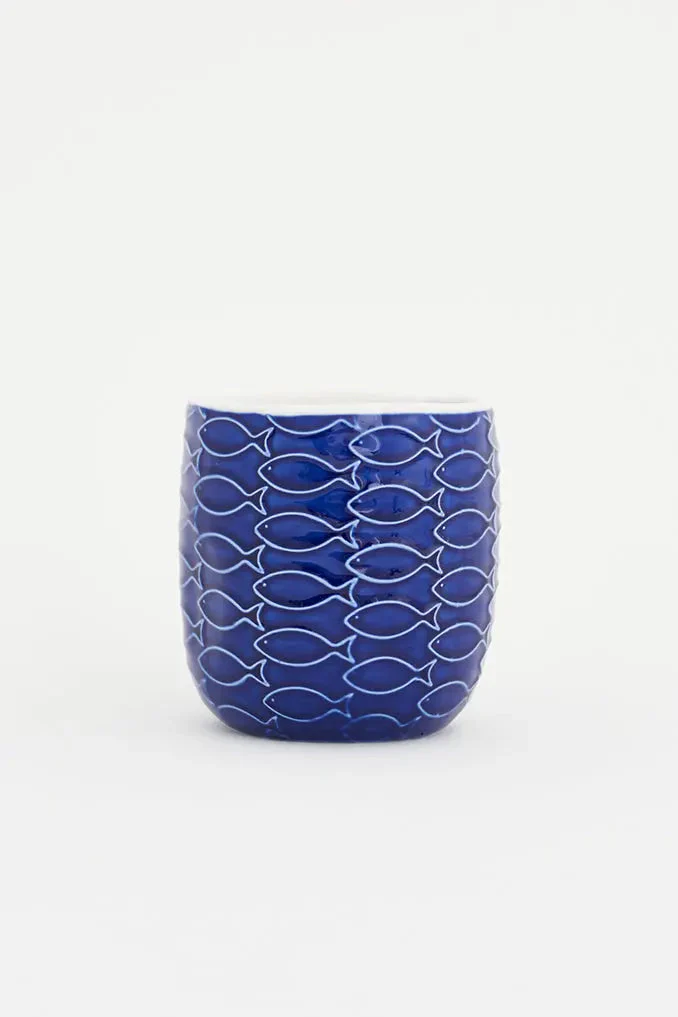 Taza de café en cerámica con peces pequeña sin asa: estilo náutico en azul y blanco