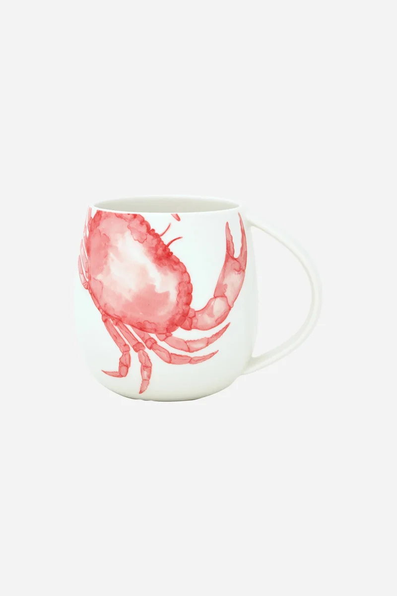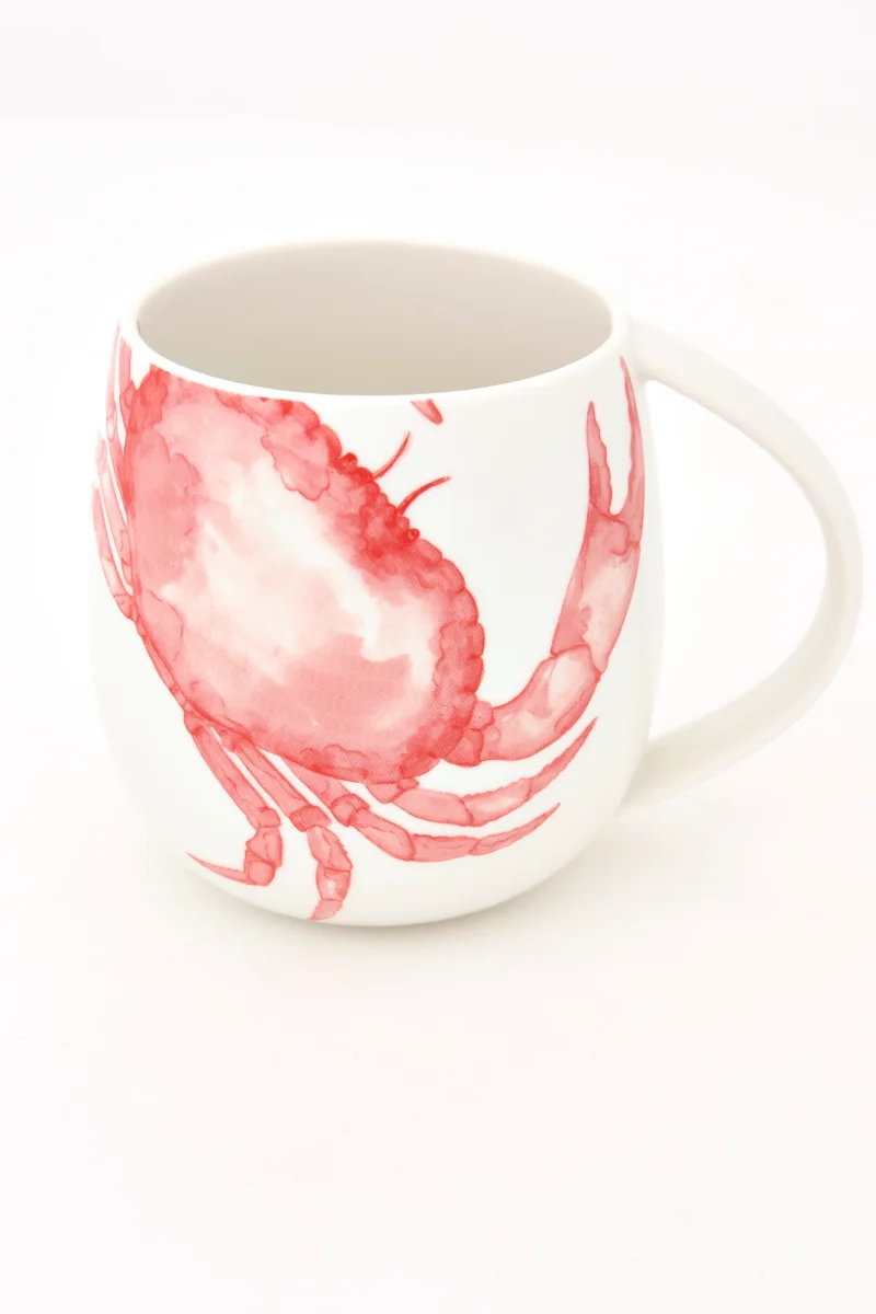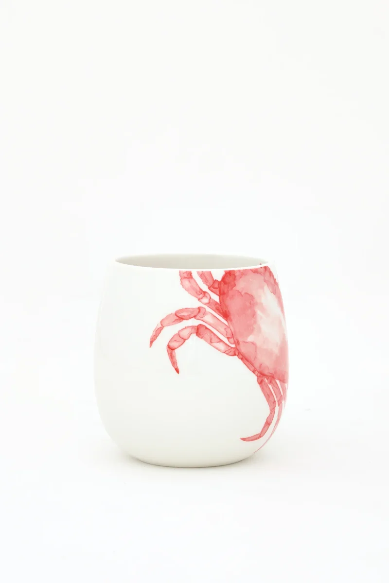 Taza decorada con un cangrejo pintado en color rojo en uno de sus laterales. El diseño aporta un toque distintivo y marino. Una pieza funcional para la mesa del día a día.