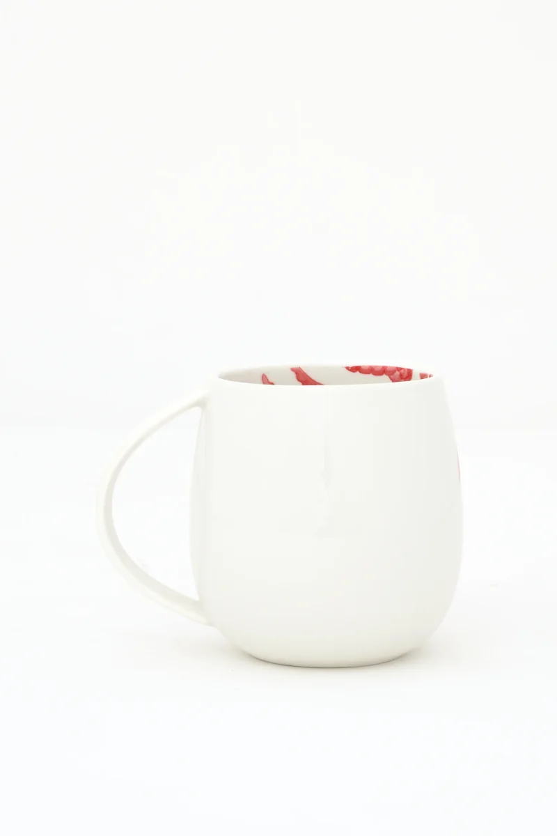 Taza decorada con un cangrejo pintado en color rojo en uno de sus laterales.