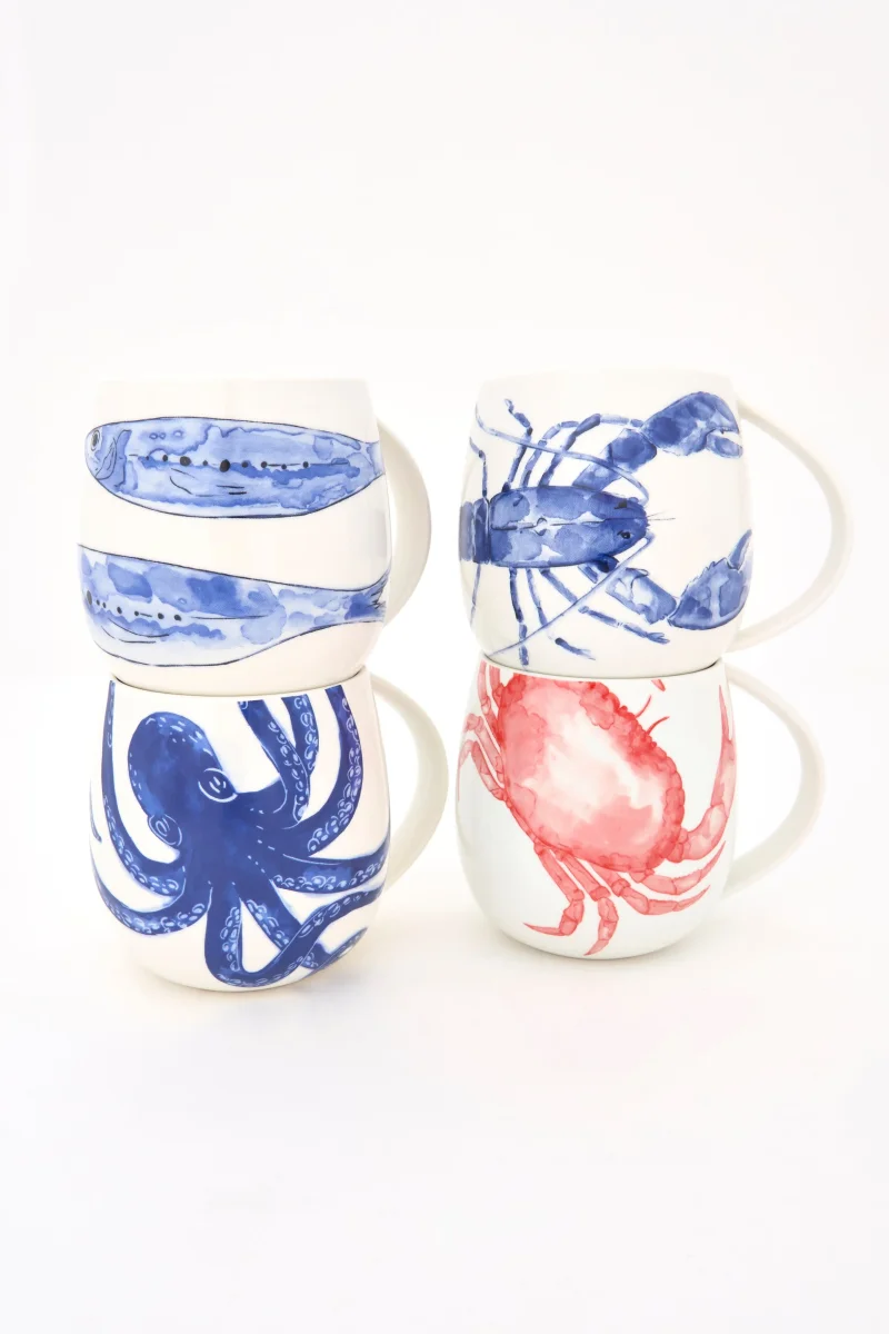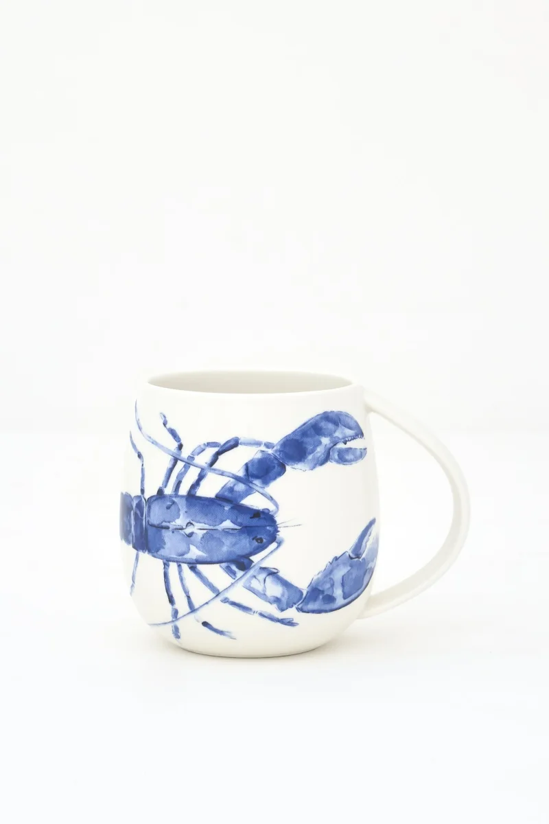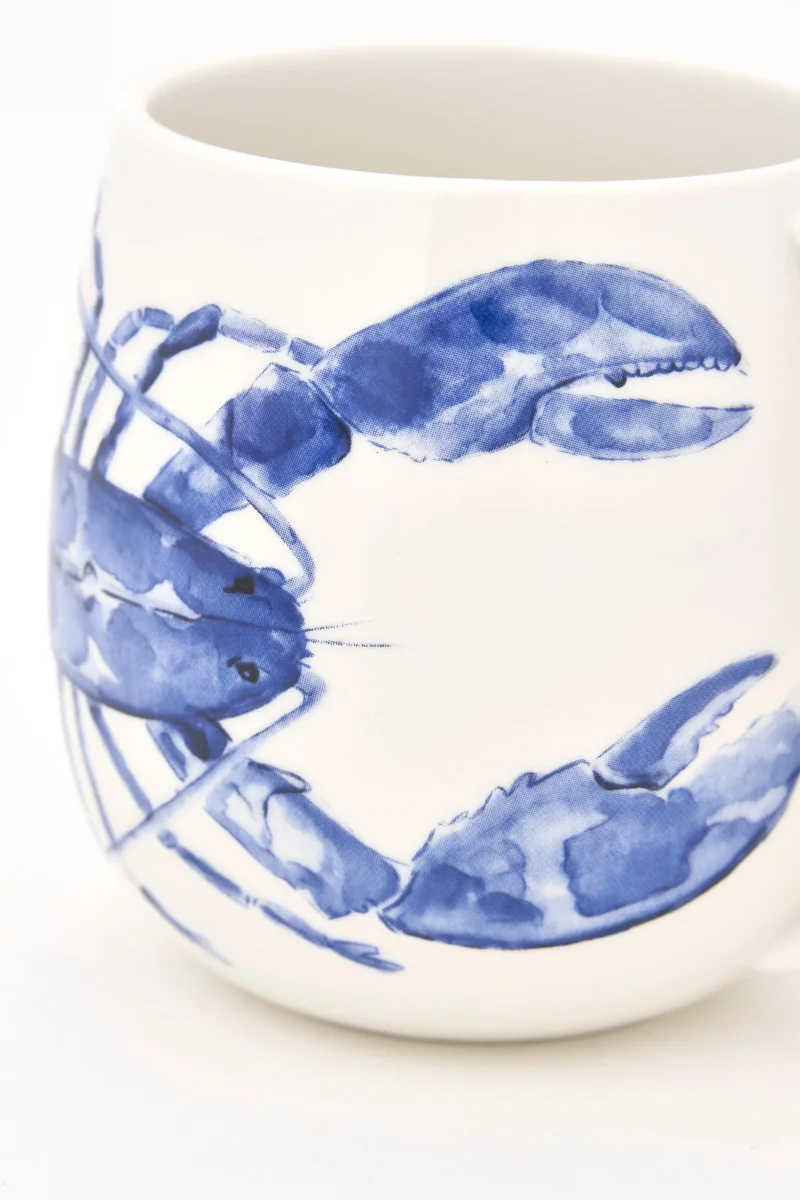 Taza decorada con una langosta pintada en color azul en uno de sus laterales. El diseño aporta un toque distintivo y marino. Una pieza funcional para la mesa del día a día.
