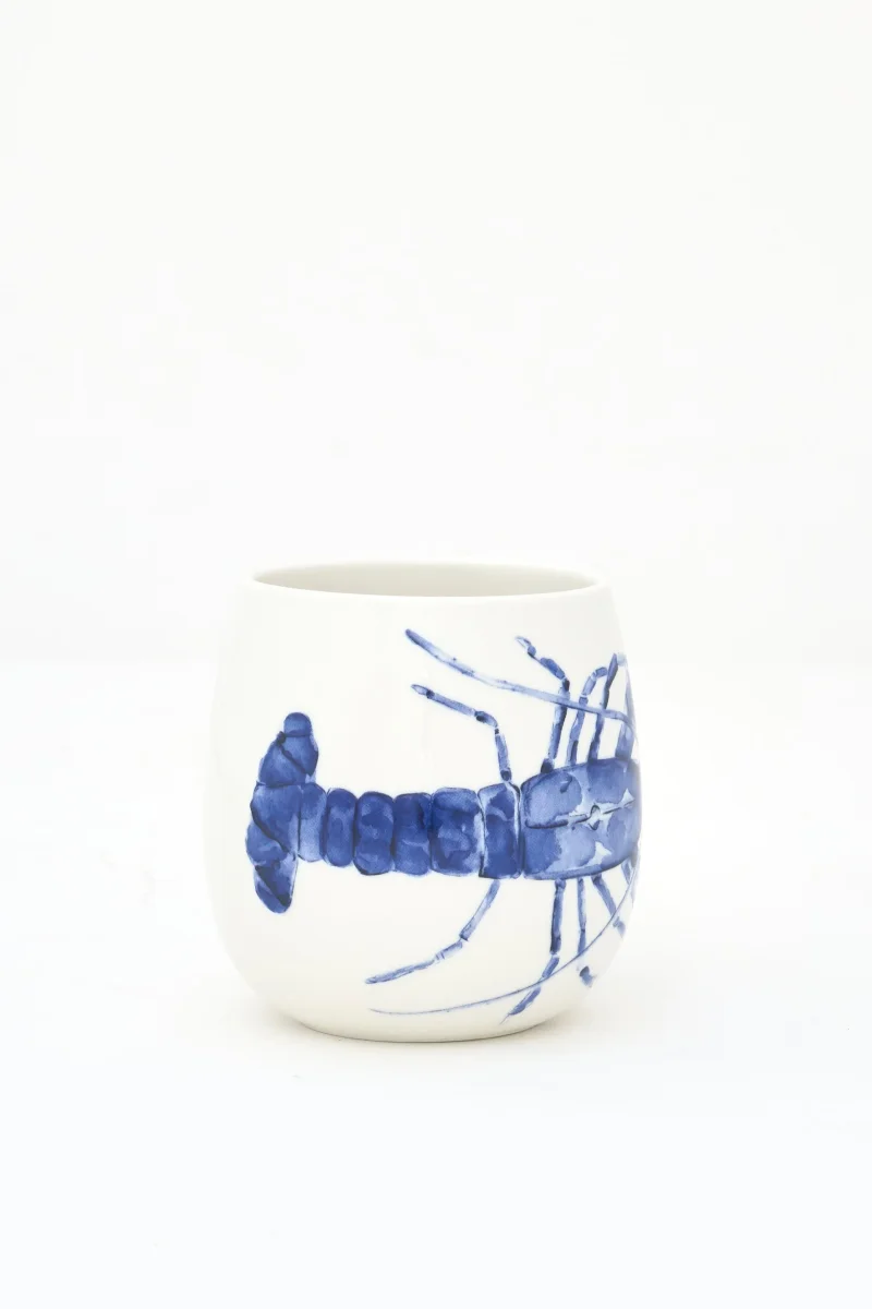 Taza decorada con una langosta pintada en color azul en uno de sus laterales.