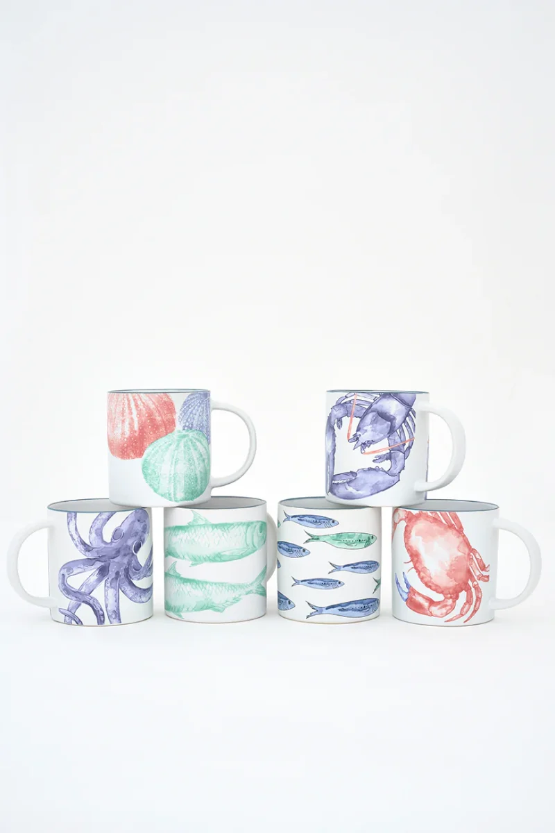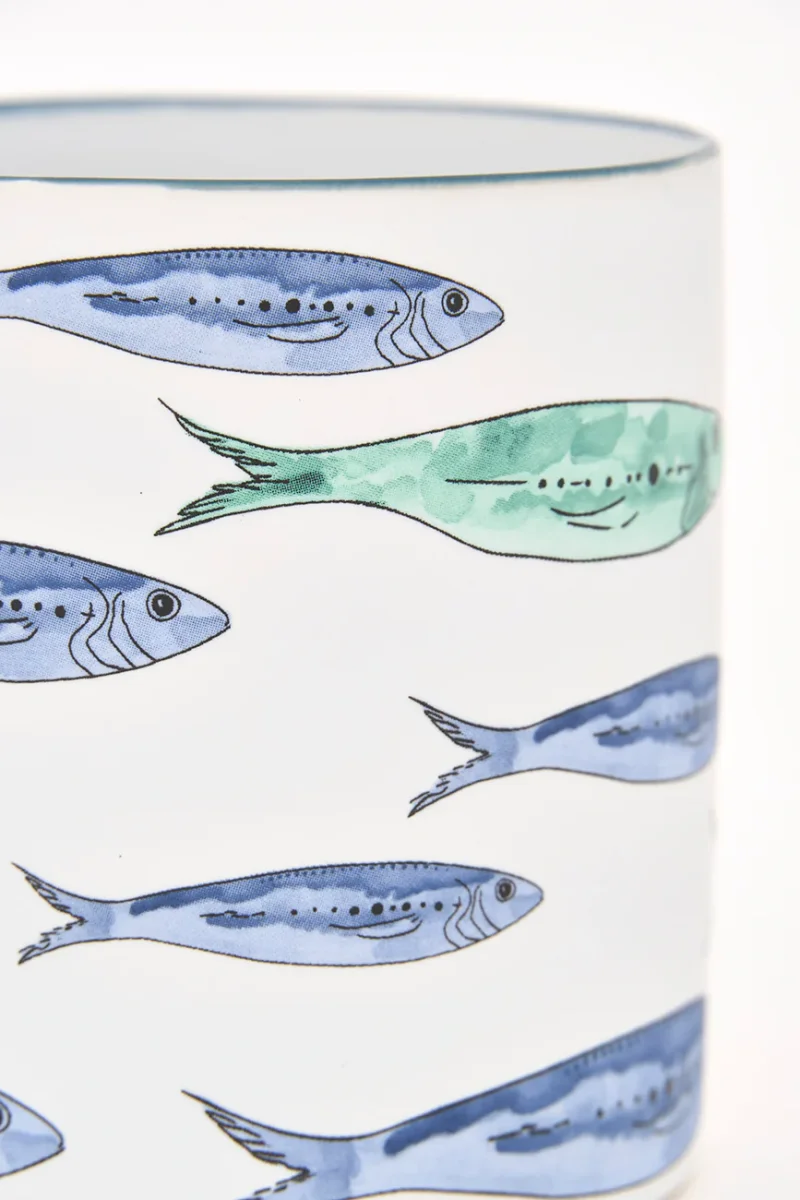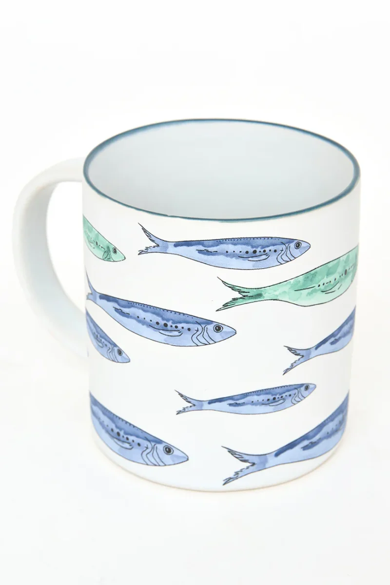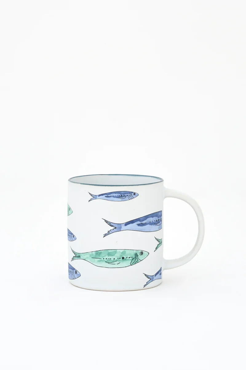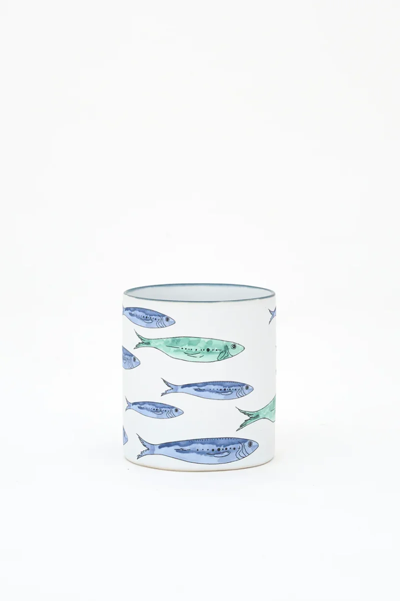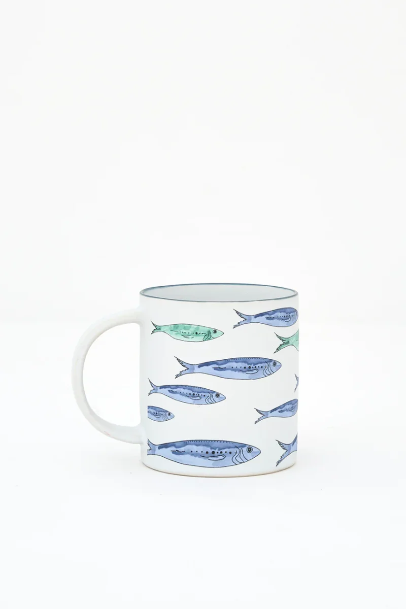 Taza elaborada en gres y decorada con un banco de peces pintado. Combina con el plato grande del mismo diseño. Una pieza funcional con un marcado estilo marinero.