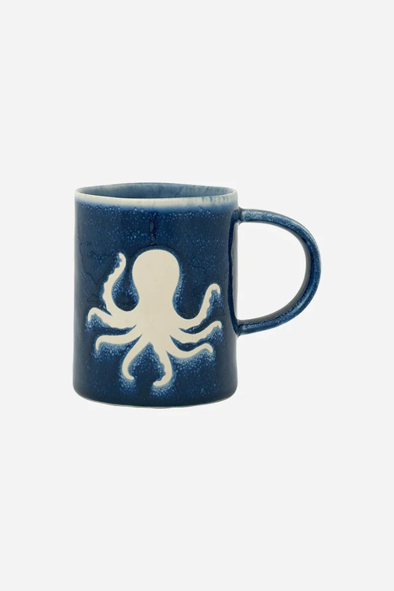 Taza de gres en color azul marino decorada con un pulpo pintado en blanco. Presenta un acabado ligeramente envejecido. Una pieza con marcado carácter marinero para el uso diario.