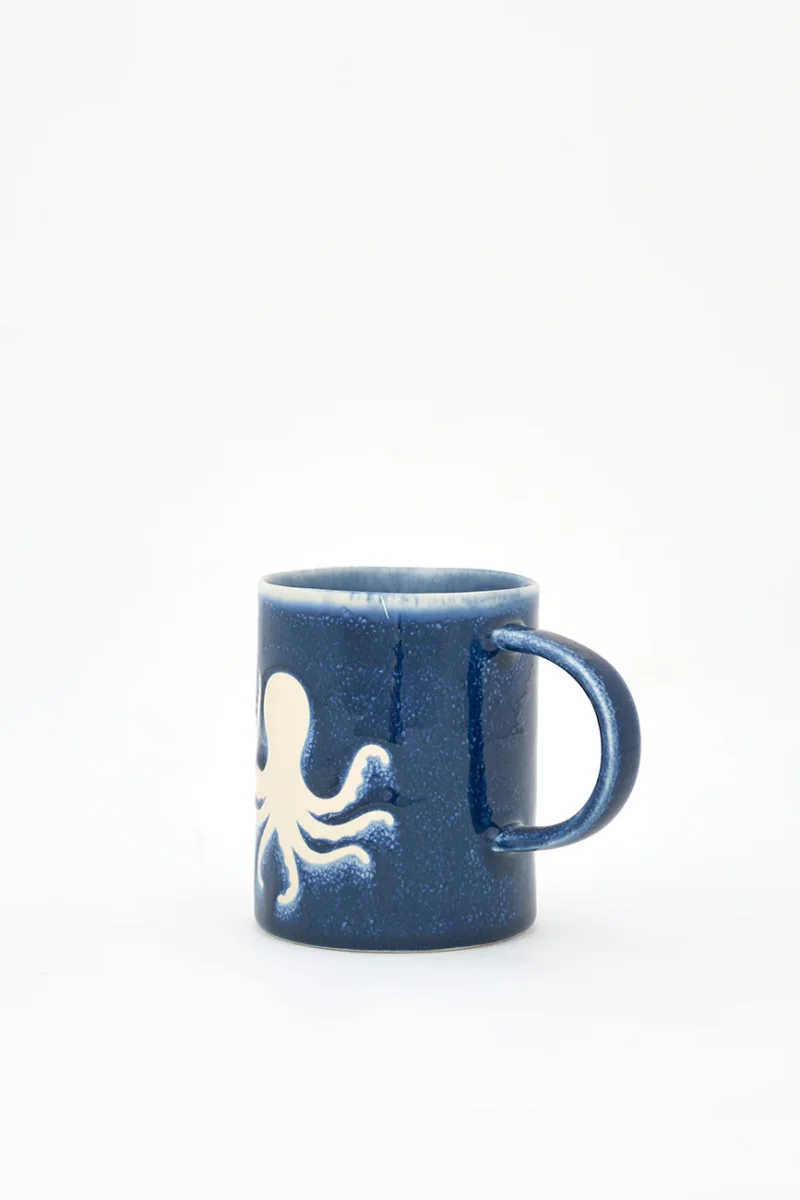 Taza de gres en color azul marino decorada con un pulpo pintado en blanco.