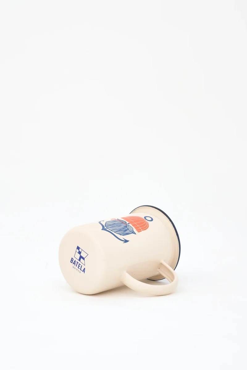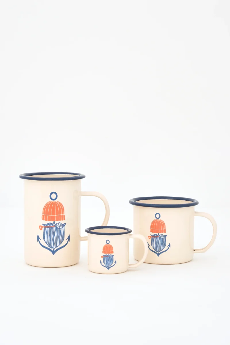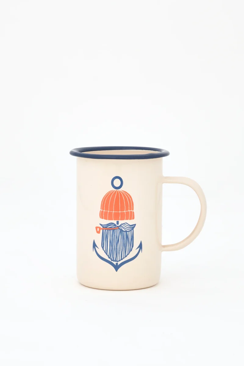 Taza de esmalte blanco con ilustración marinera y borde azul marino, de estilo clásico y funcional. Ideal para desayunos y pausas con aire náutico.