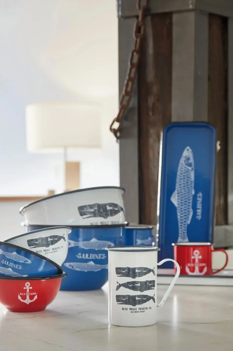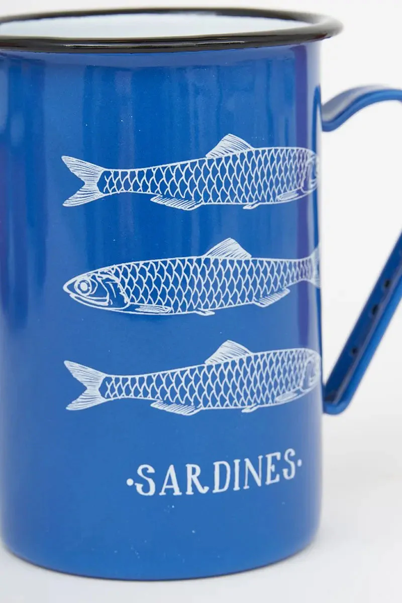 Taza larga de metal esmaltado en color azul. Lleva dos sardinas pintadas en color blanco con el texto ‘Sardines’.
