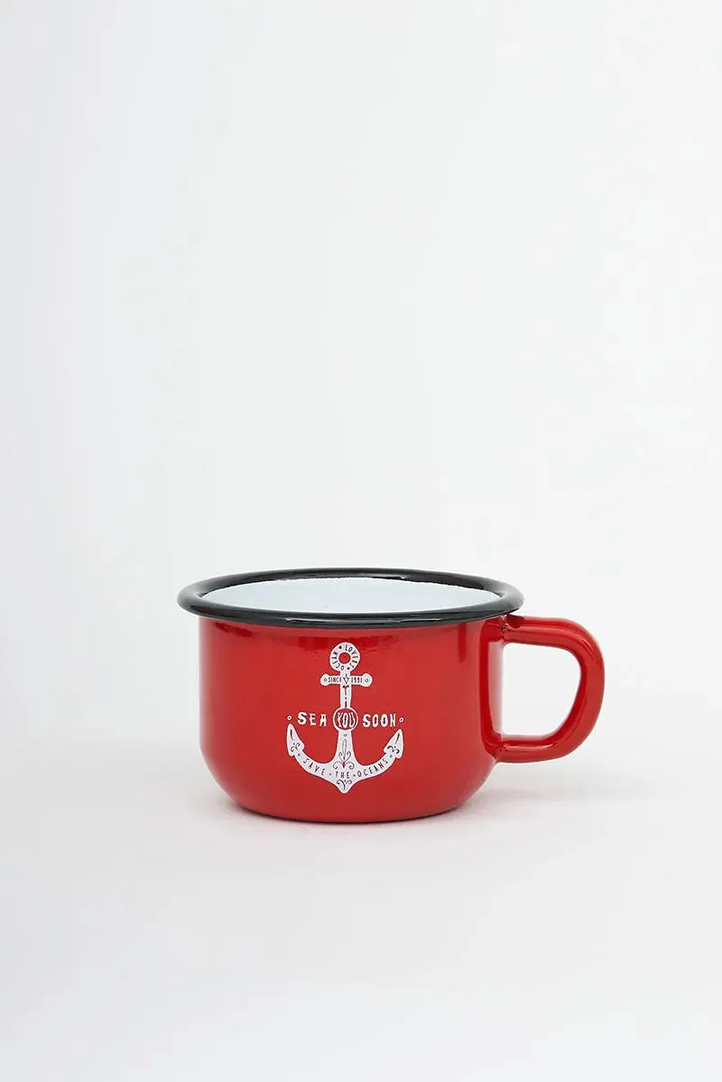 Taza mediana de metal esmaltado para café en color rojo. Lleva un ancla pintada en blanco con el texto ‘See you soon’.