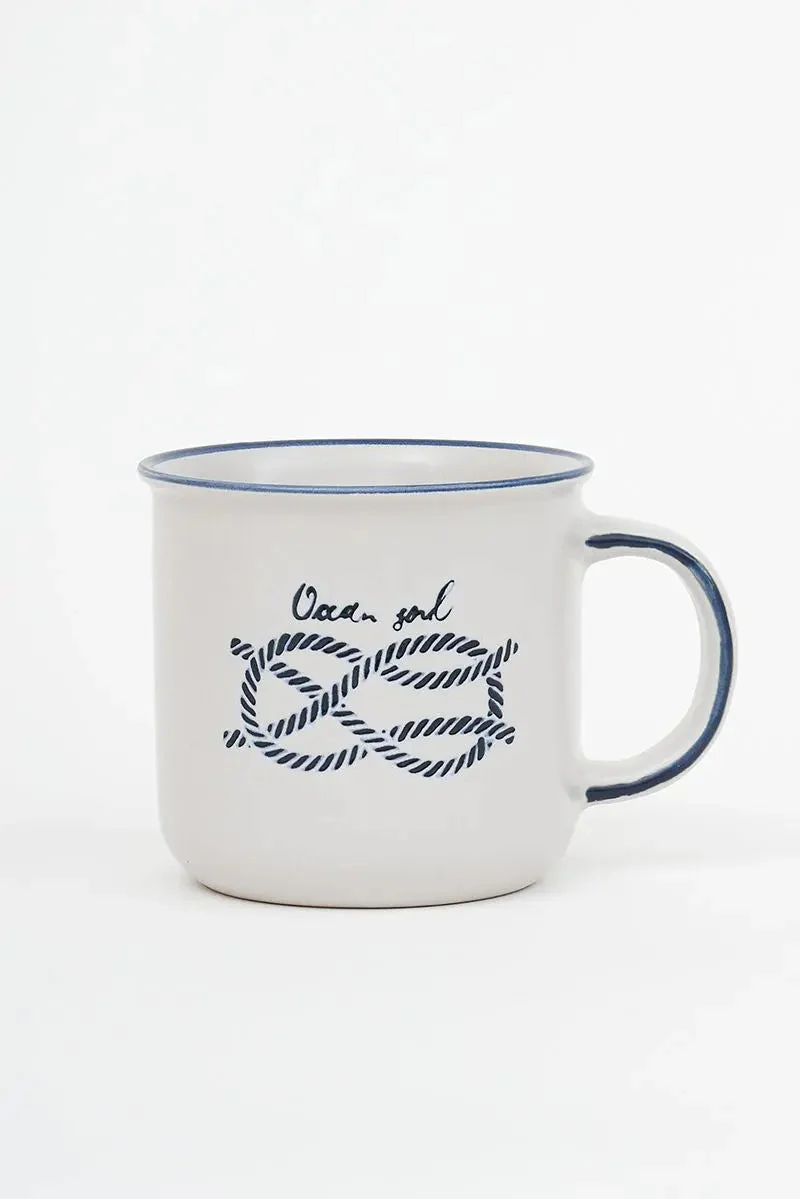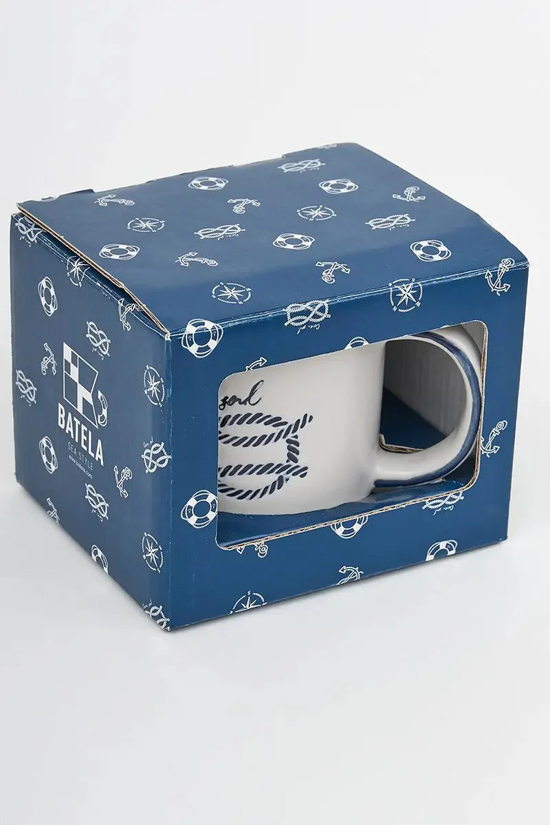 Taza de gres con un nudo marinero en color azul impreso. Viene con una caja de cartón.