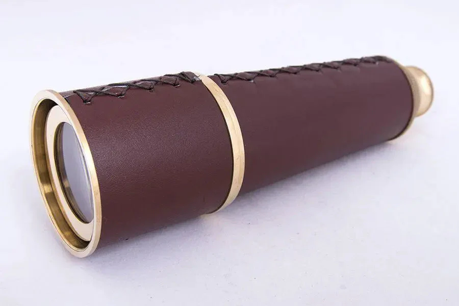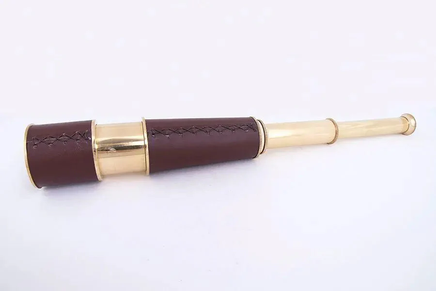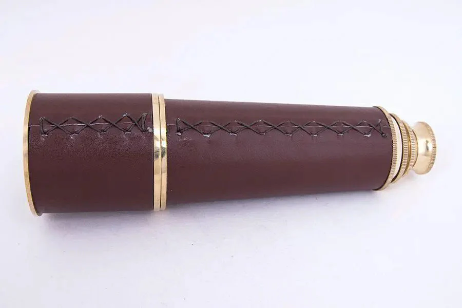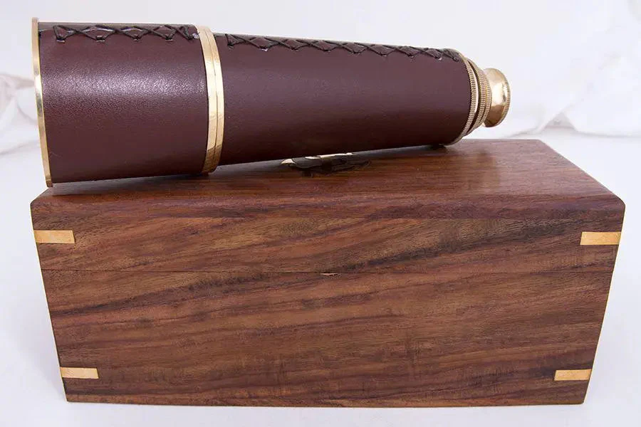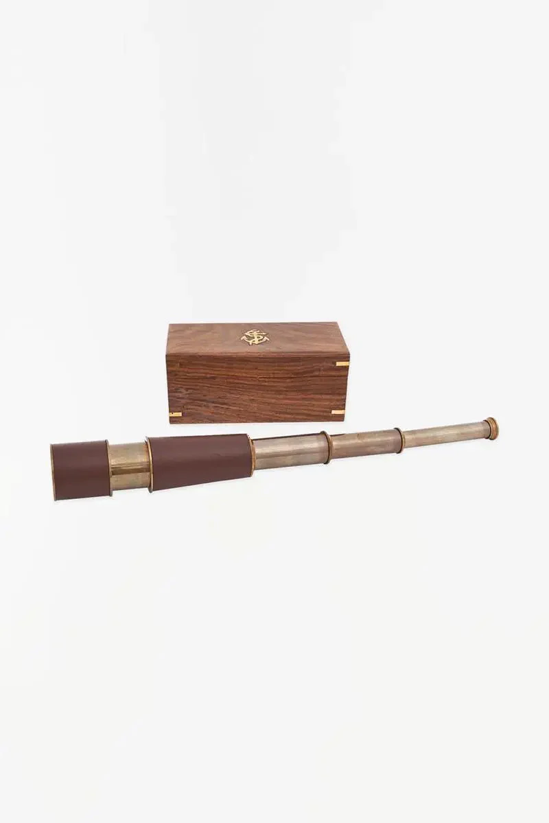 Telescopio de latón y cuero con una terminación envejecida. Viene en una caja de madera.
