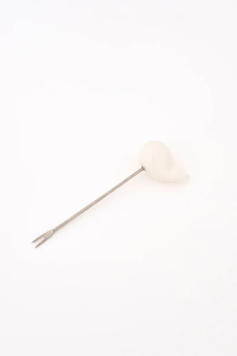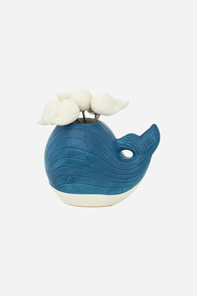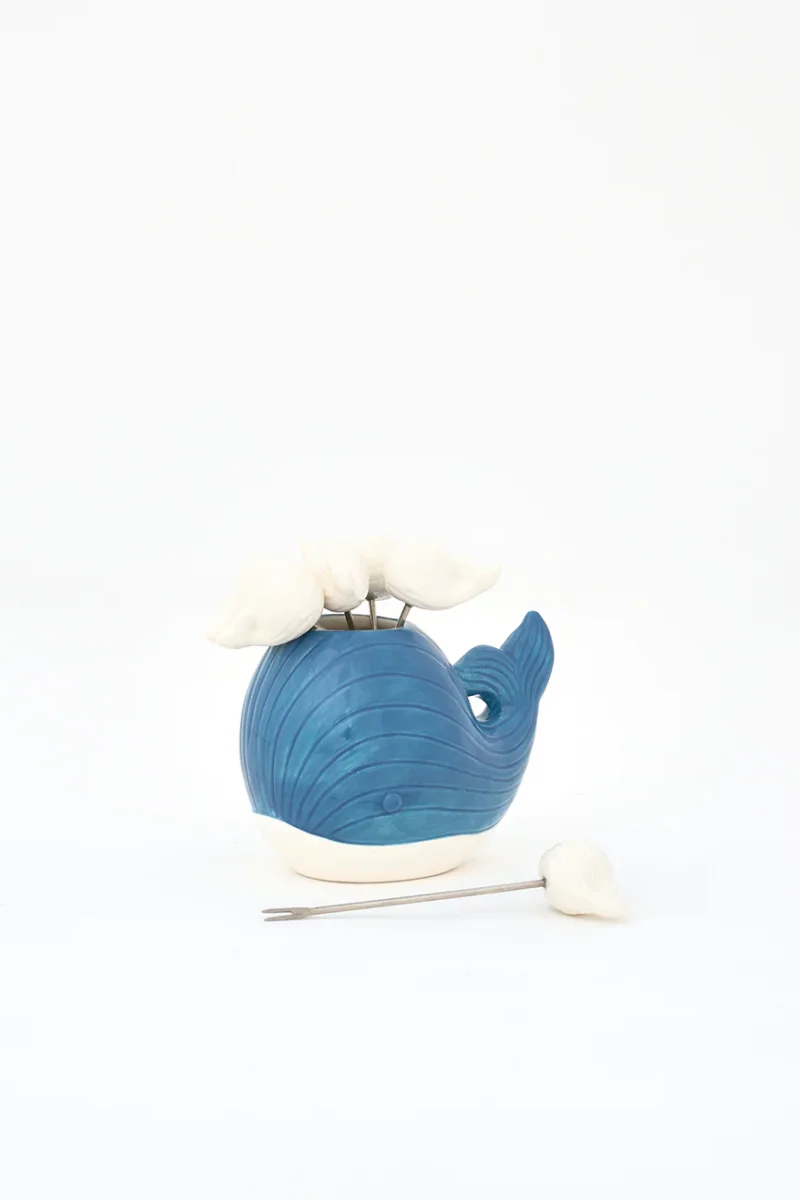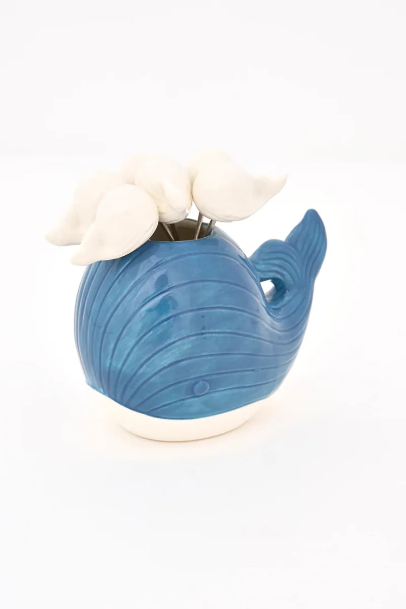 Juego de tenedores de cóctel con soporte decorativo en forma de ballena. Los tenedores combinan acero inoxidable y cerámica, y el soporte está realizado en cerámica. Una pieza funcional y decorativa para servir aperitivos con estilo.