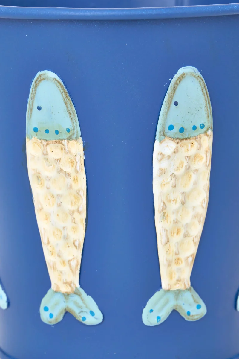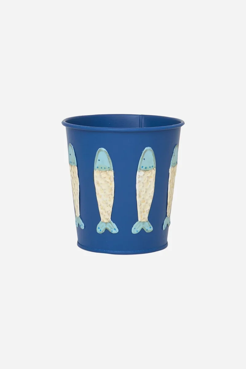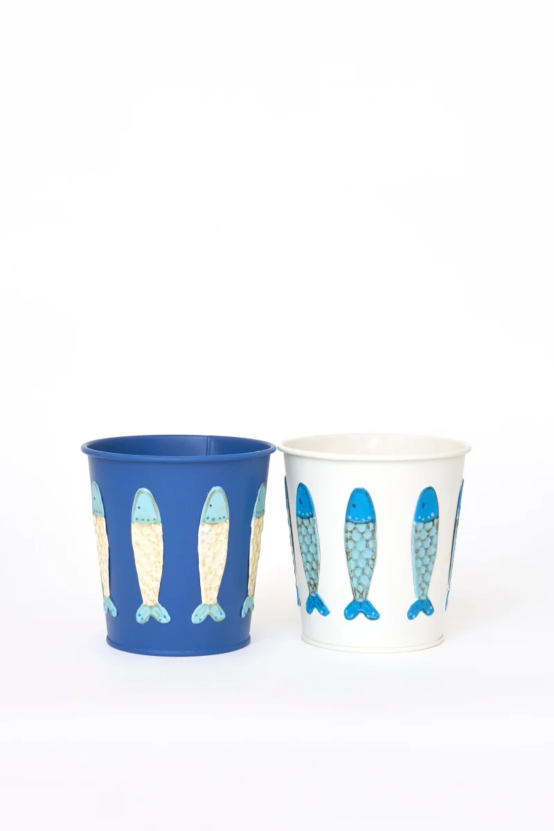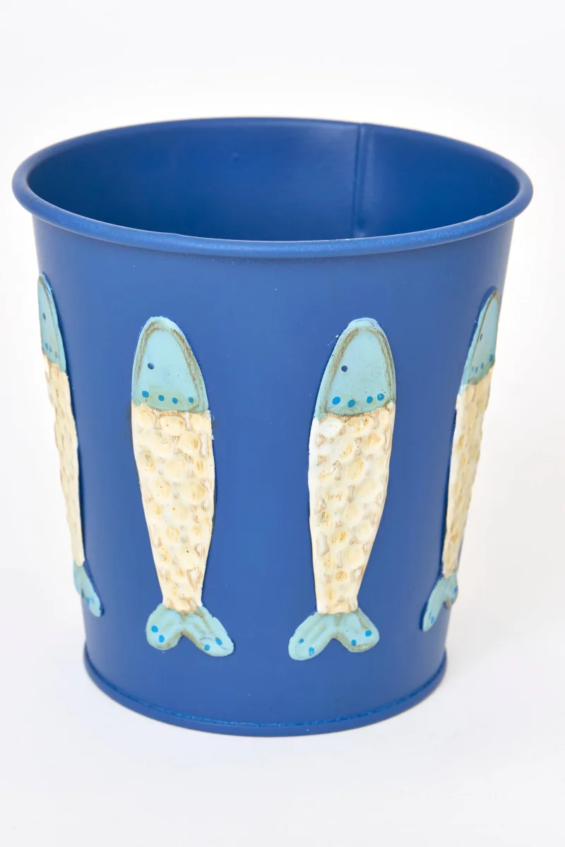 Tiesto elaborado en hojalata de color blanco. Decorado con peces en relieve en tonos turquesa y azul cielo. Una pieza decorativa y funcional con inspiración marina.