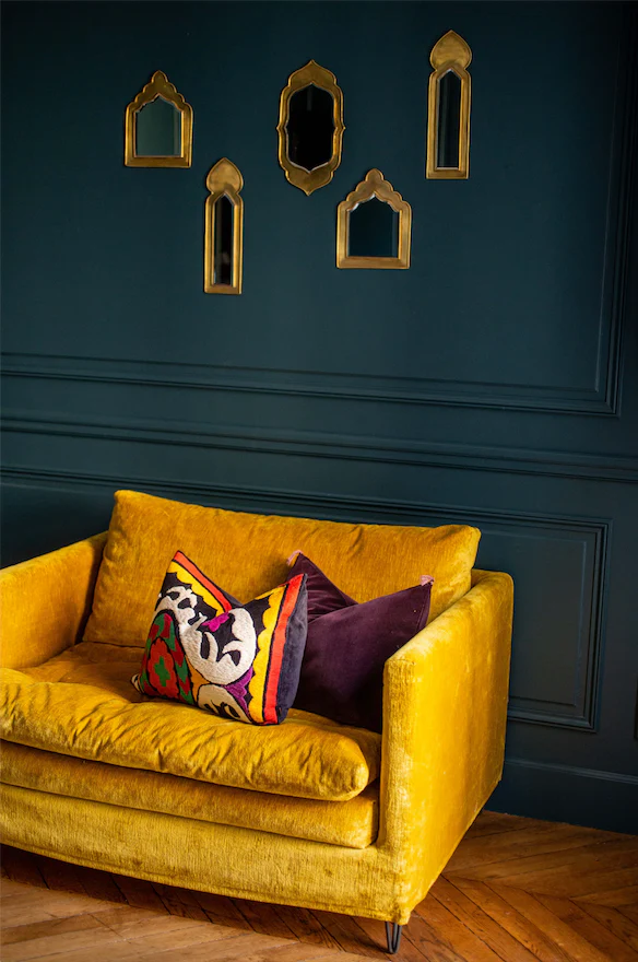 Idéal pour tous les sièges, du canapé au fauteuil, on peut aussi oser le décliner en tête de lit. Ce qui fait le charme de Vellino, c’est son effet patiné : lorsqu’on le caresse, sa couleur change car il capte la lumière différemment… Une ode à la noblesse des matières naturelles, avec un petit côté baroque qui le rend irrésistible.