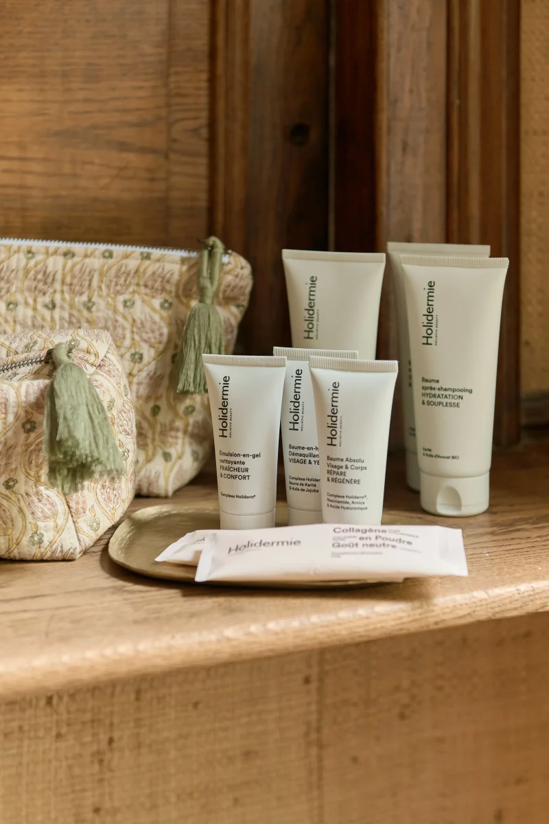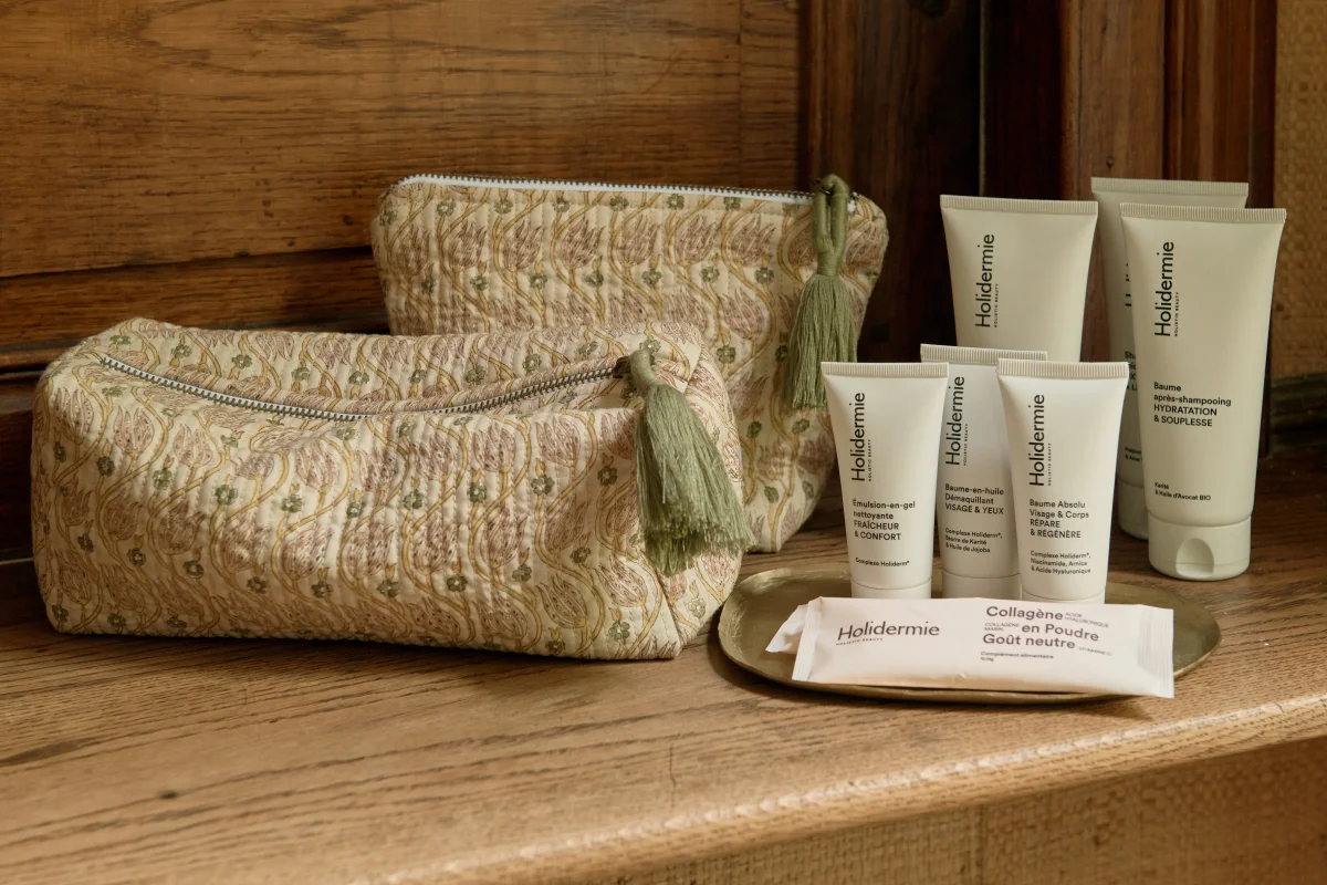 Pour cette collaboration exclusive avec Holidermie, elle se décline en deux formats et cache soigneusement une sélection de soins : un lait sculptant 100 ml, un shampoing micro-bulles 100 ml, un baume démaquillant 25 ml, une émulsion nettoyante 25 ml, un baume absolu corps et visage 25 ml, ainsi que deux sticks de collagène en poudre.