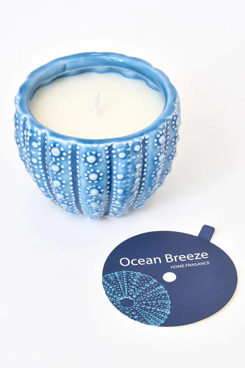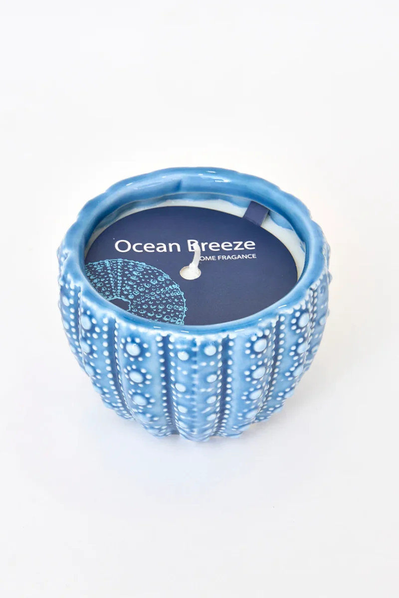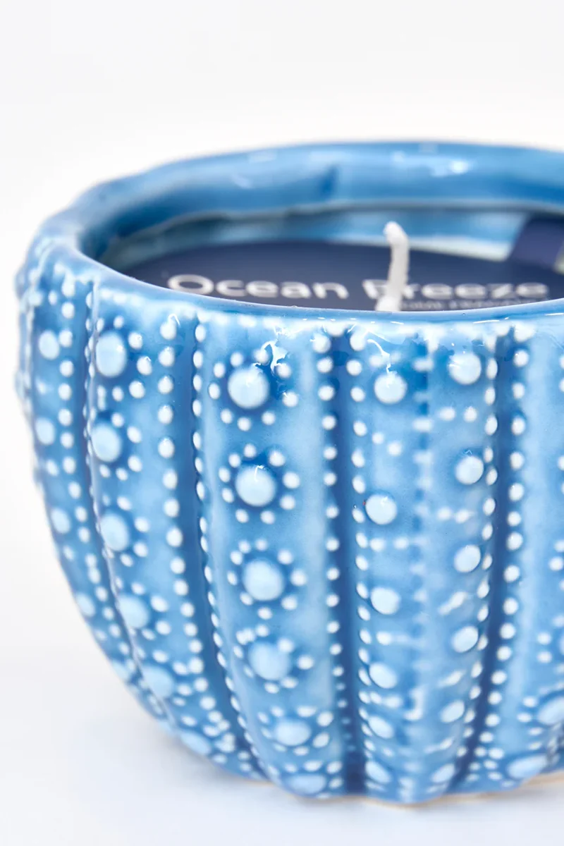 Vela decorativa en recipiente con forma de erizo texturizado de inspiración marina, con acabado en tonos claros que recuerdan al fondo del océano. Un diseño sobrio y natural que aporta una luz suave y relajante