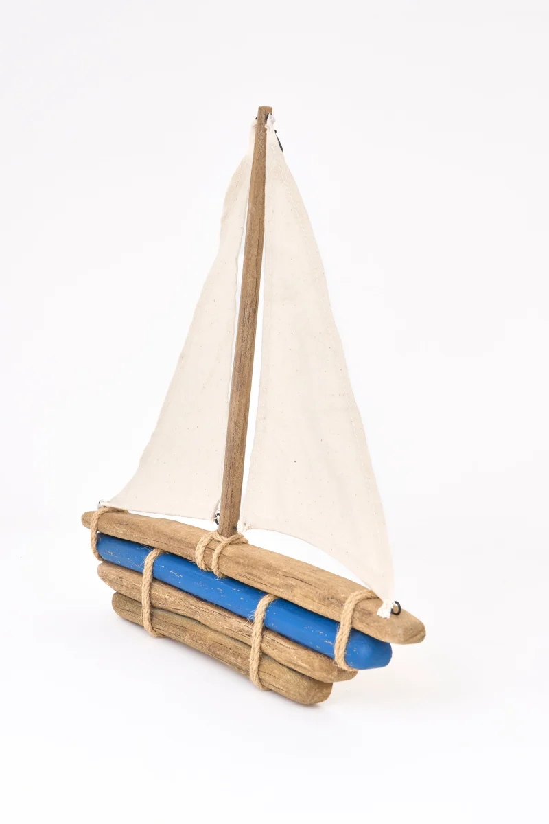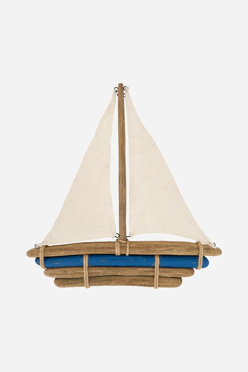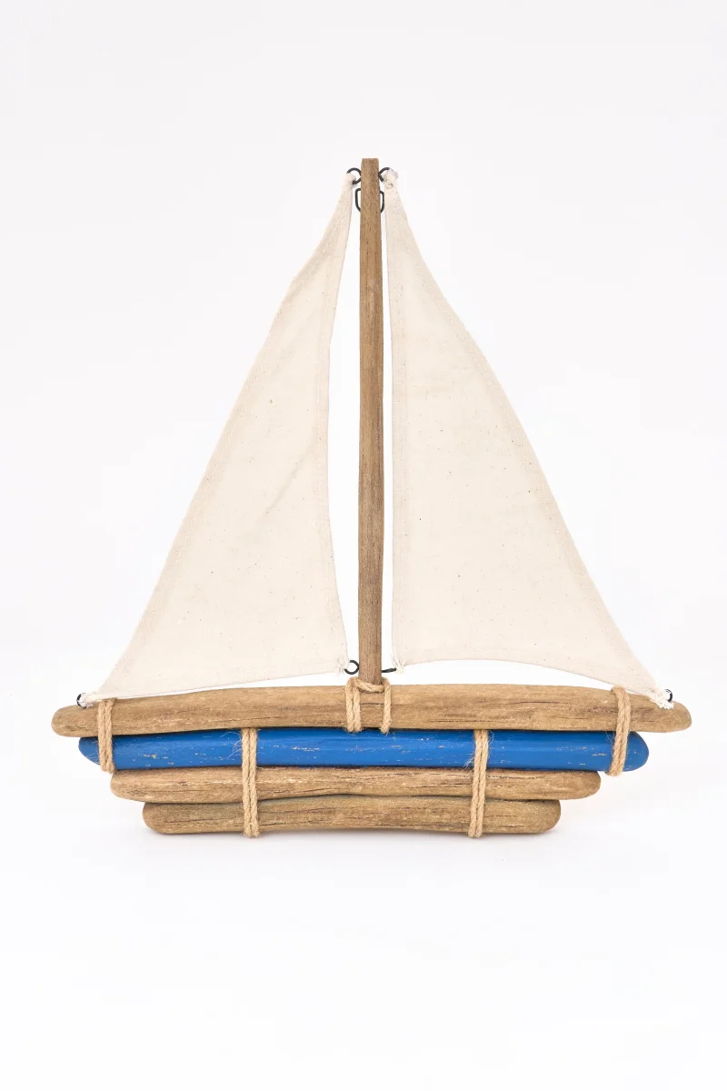 Velero decorativo realizado en madera driftwood con velas textiles y detalles en cuerda. Una pieza de estilo marinero con acabado natural, ideal para aportar un aire costero y relajado a cualquier espacio.