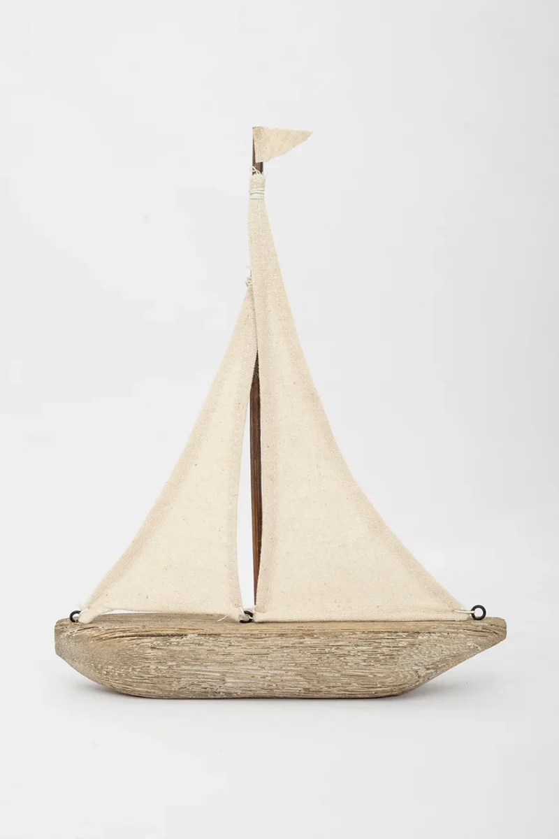 Velero hecho de madera, con vela de tela, para decorar pequeños espacios