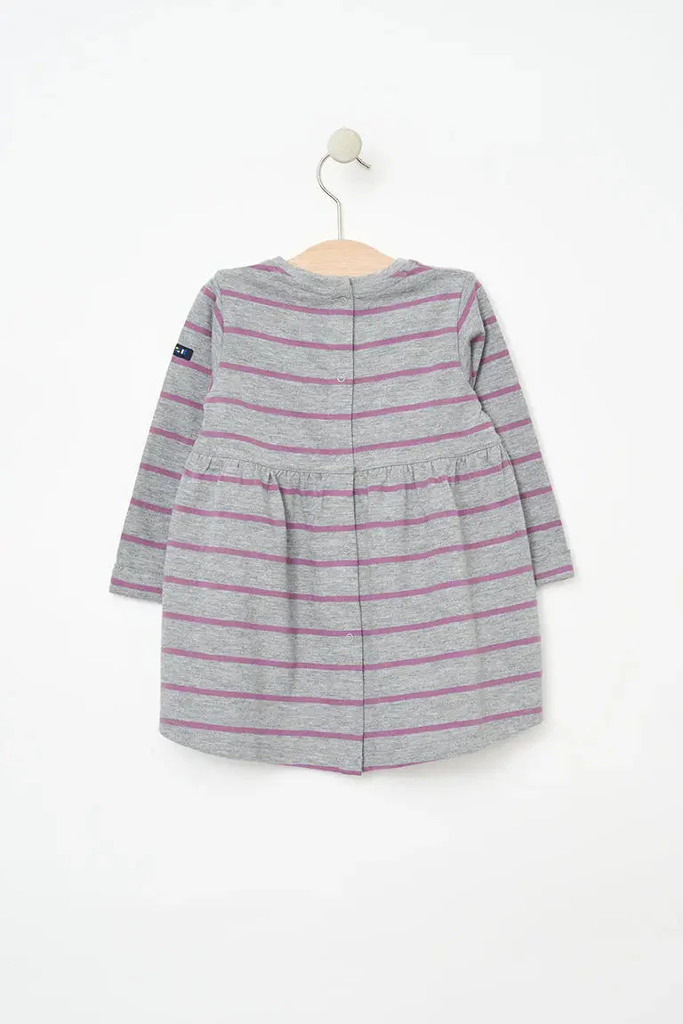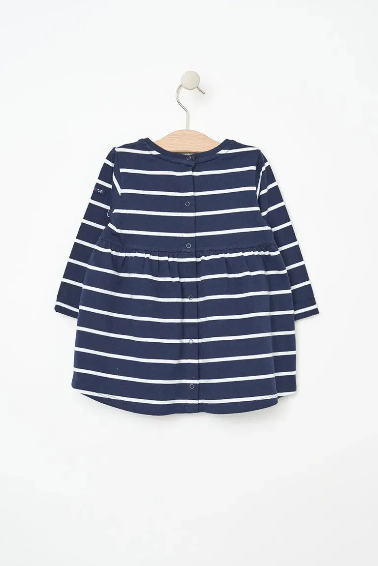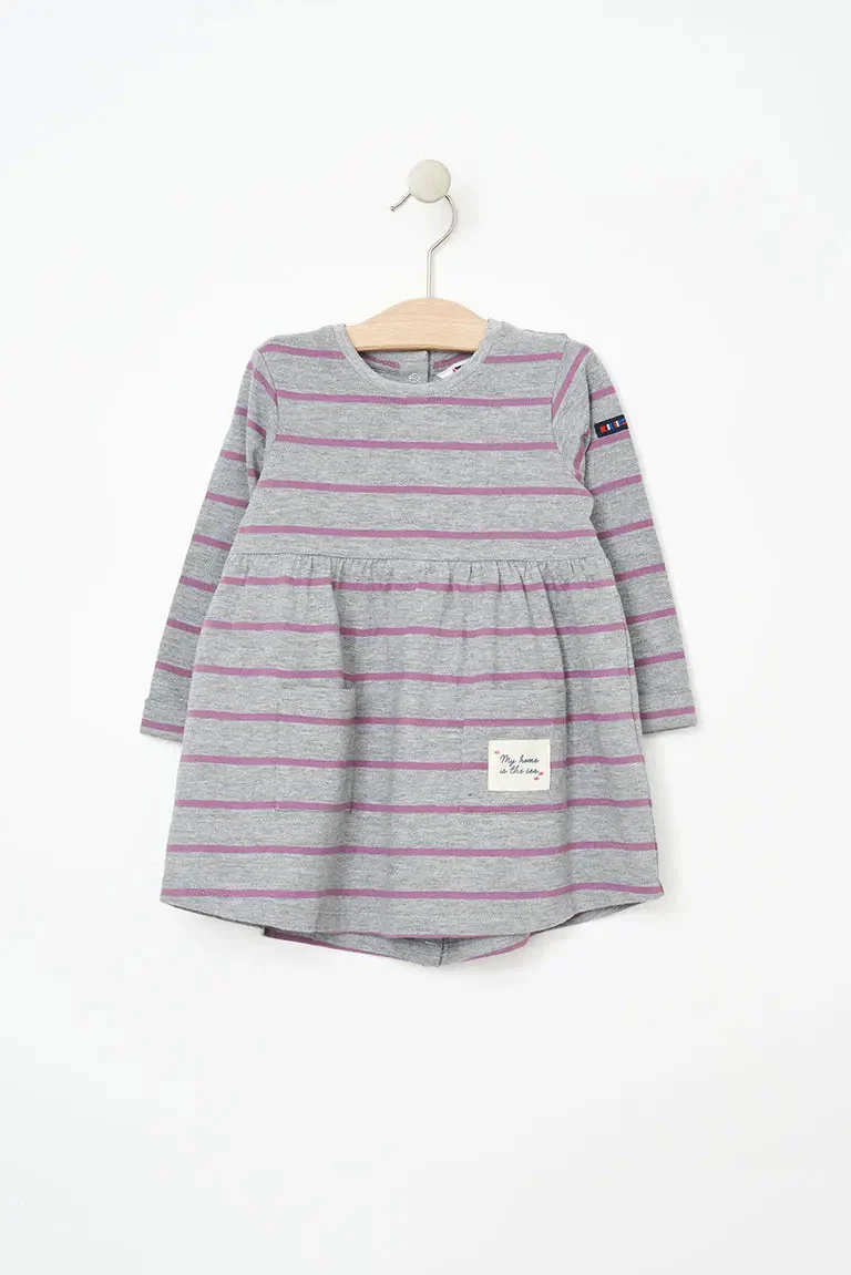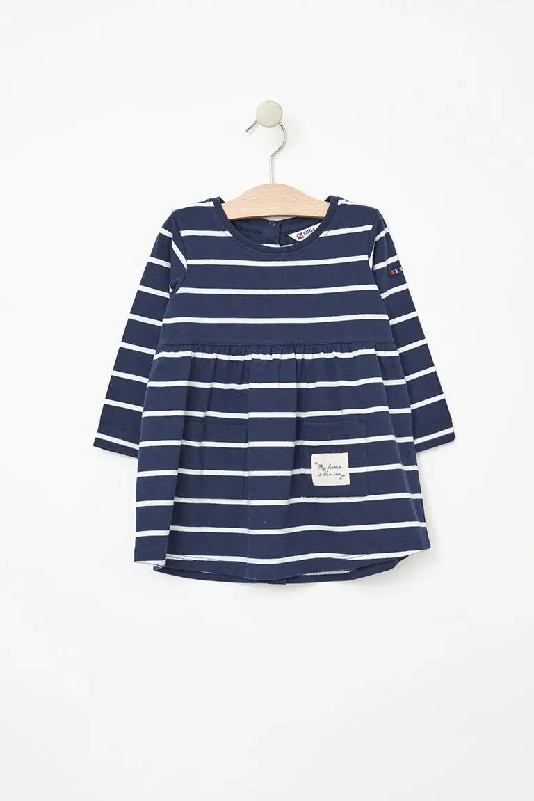 Vestido de bebé a rayas de manga larga confeccionado en algodón de 220 gramos. Un tejido cálido y duradero perfecto para el invierno.